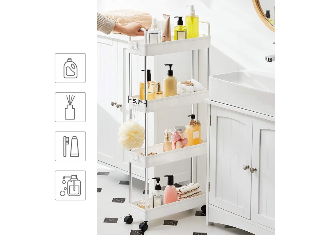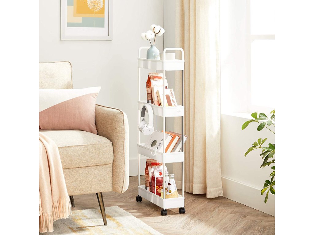 Úložný vozík, tenký vozík, 4-patrový kuchyňský vozík, úzký koupelnový vozík s kolečky a madly, 40 x 13 x 93 cm, bílý.