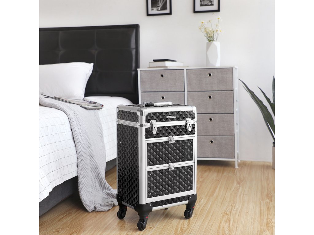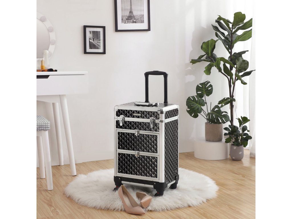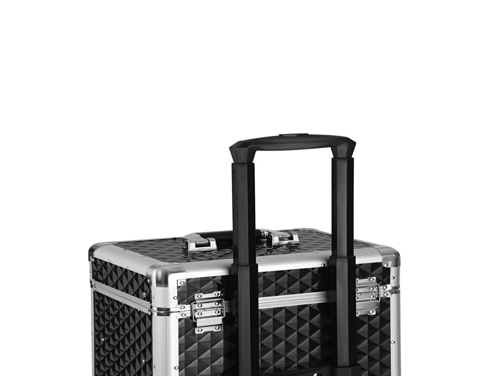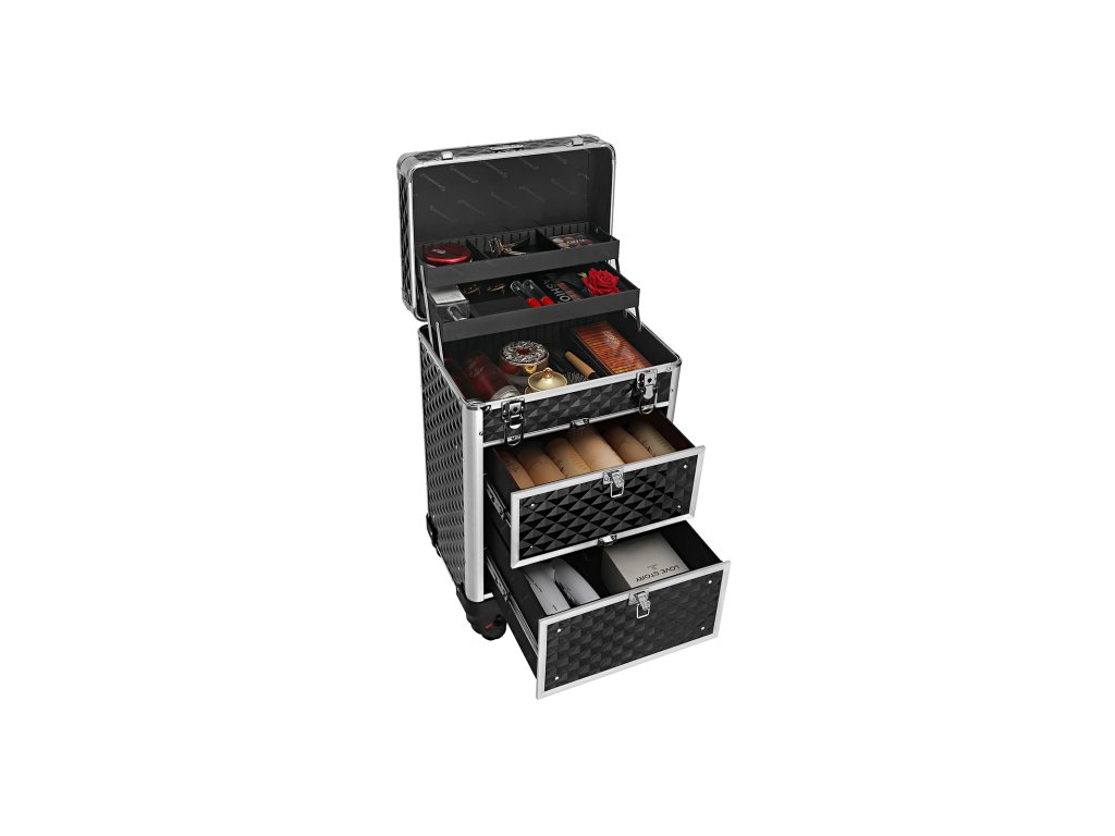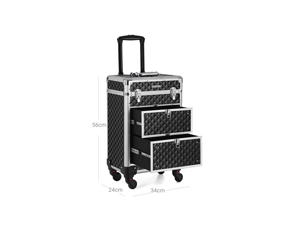 Uzamykatelný kufřík na líčení, pojízdný kosmetický vozík, pro profesionální vizážisty, kosmetická studia, nehtové techniky, ABS, hliník, 34 x 27 x 57 cm, černý.