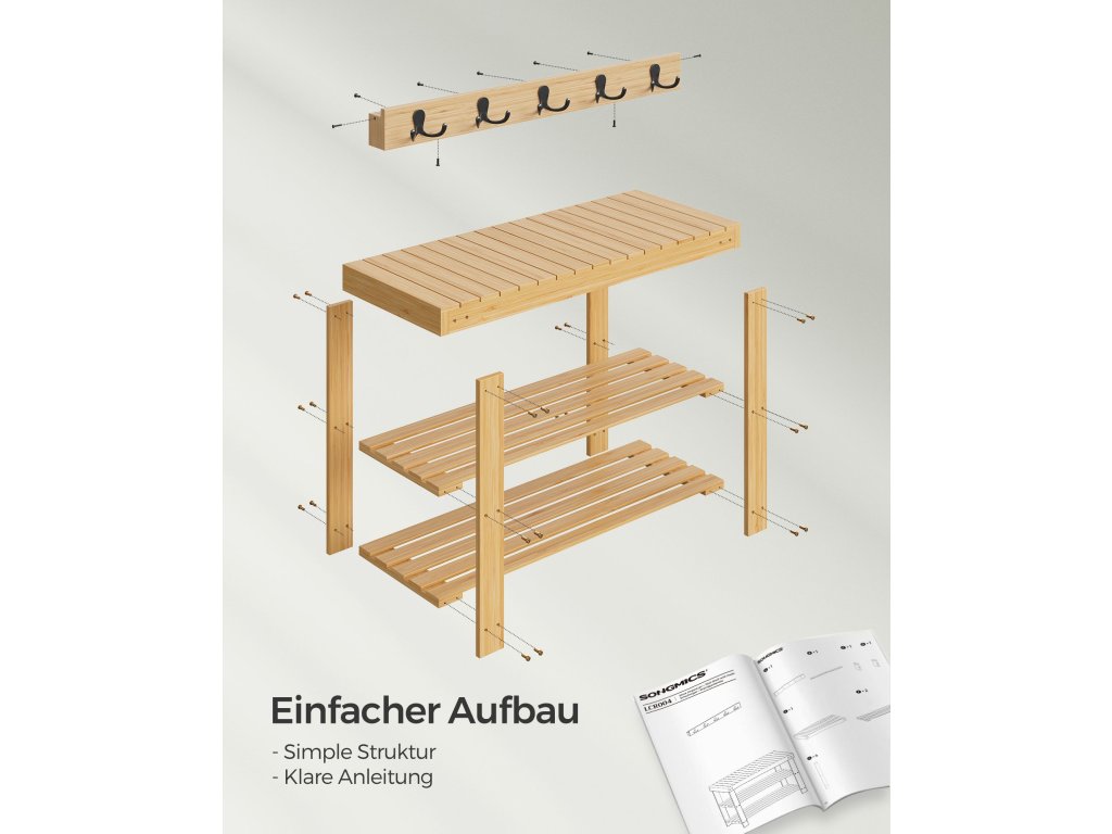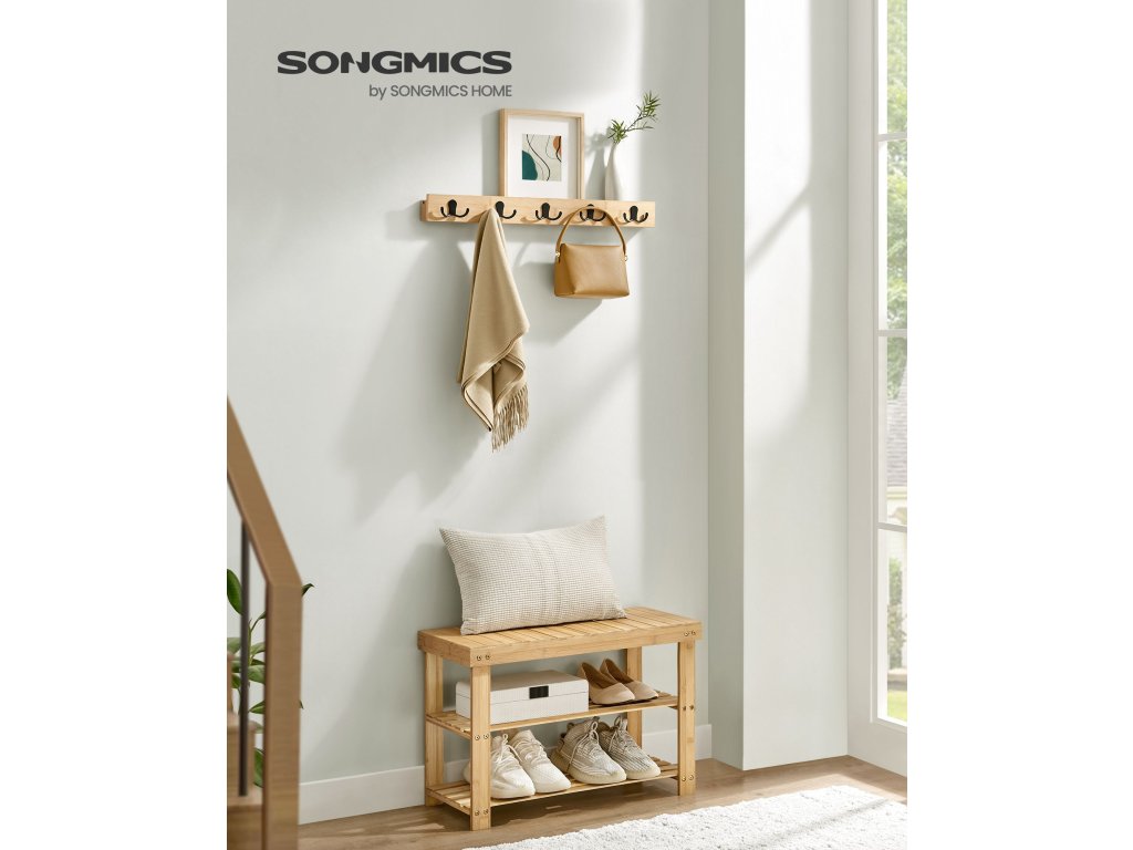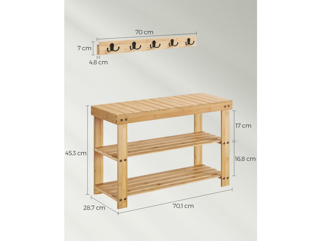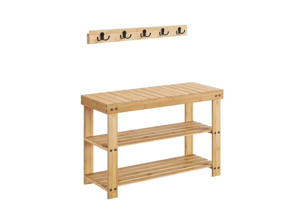 Věšák a lavice na boty, předsíňová skříň, multifunkční 5 dvojitých kovových háčků, bambusový botník se 3 úrovněmi, do předsíně, ložnice, přírodní béžová.