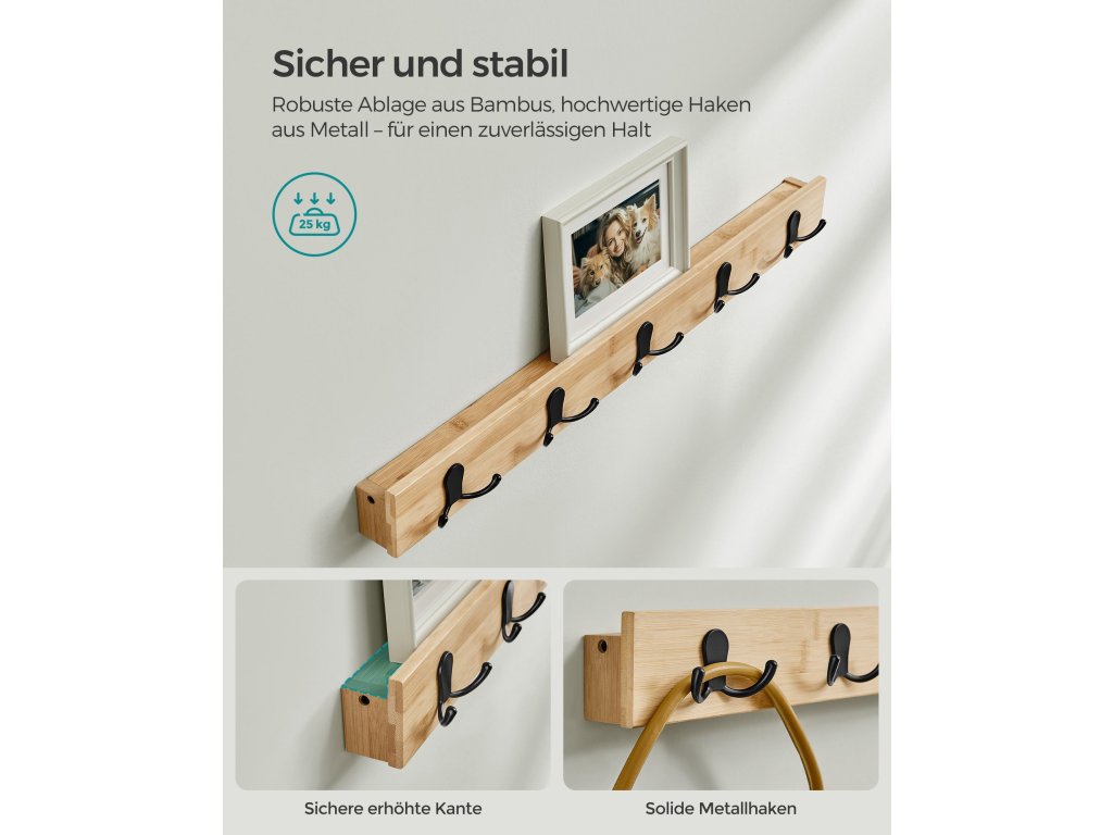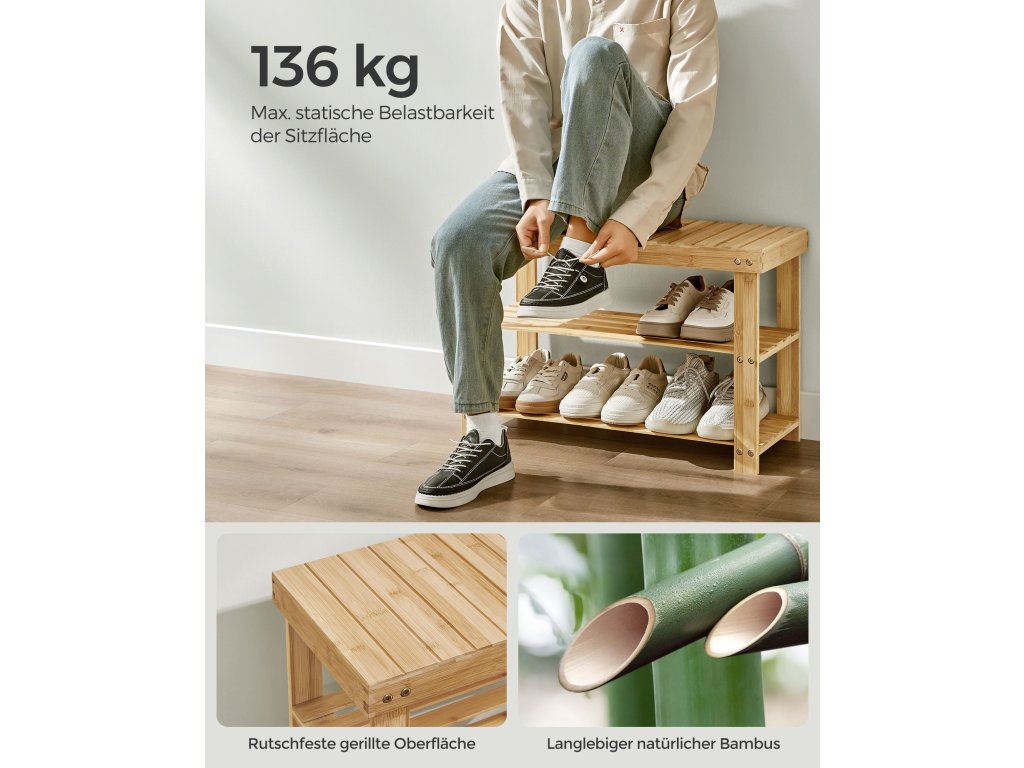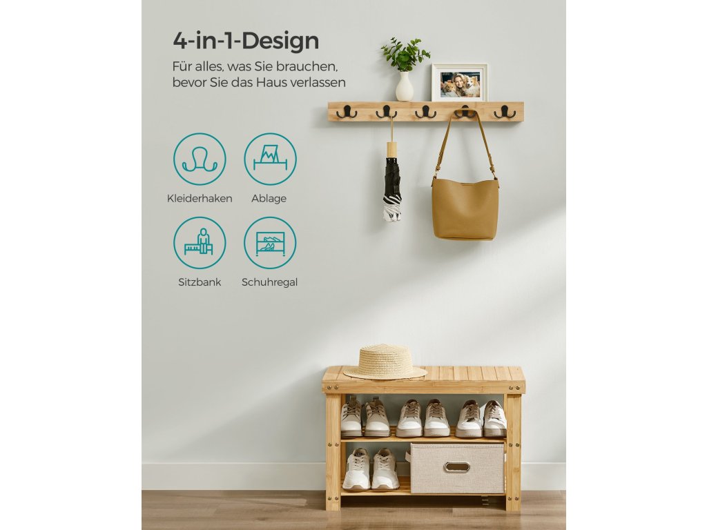 Stylový a praktický Tento věšák a lavice na boty je praktický a estetický a udržuje pořádek. Nebojte se barev, jsou sladěny se všemi styly interiéru!.Nábytek do předsíně 4 v 1 s lavicí Tato sada obsahuje polici na drobnosti, 5 dvojitých háčků na zavěšení tašek, oblečení a deštníků a lavici se 2 spodními policemi. S ním máte vše, co potřebujete, abyste se dostali ven!.Spolehlivá opora Lavice na boty je vyrobena z přírodního bambusu a je navržena pro dlouhodobou životnost. Unese až 300 kg a každá police snadno pojme 3 páry bot.Snadná montáž Díky jednoduché konstrukci, předmontáži a snadnému návodu lze tuto předsíňovou skříňku s lavicí sestavit během chvilky.Všestranný Věšák a lavici na boty lze použít společně nebo odděleně, lze je umístit do různých místností, jako je vstupní hala, obývací pokoj nebo ložnice, a přizpůsobit je tak vašim preferencím a sladit s jakýmkoli prostorem.| Kategorie: | Lavice do předsíně |