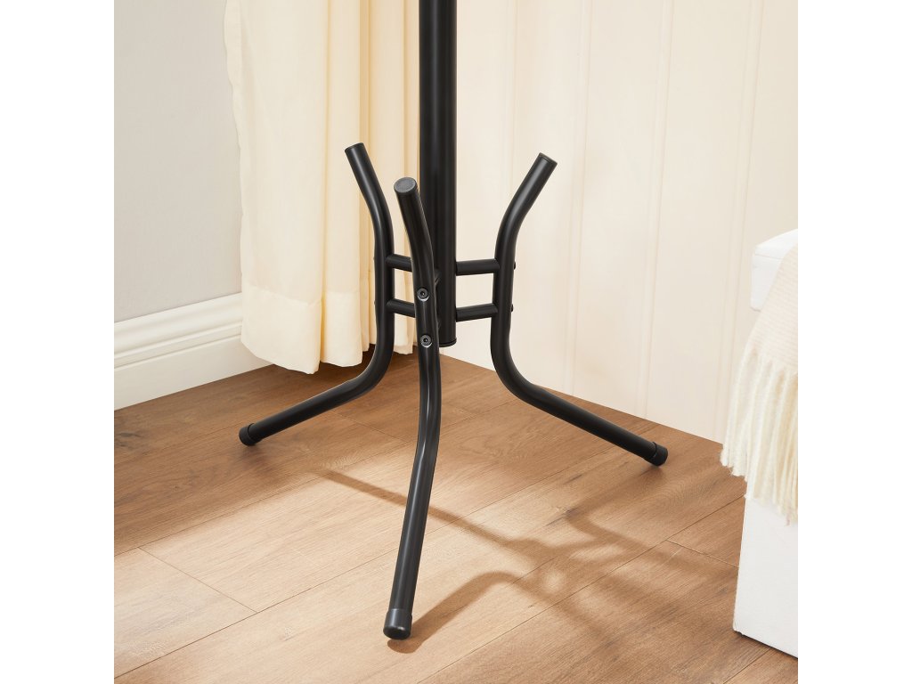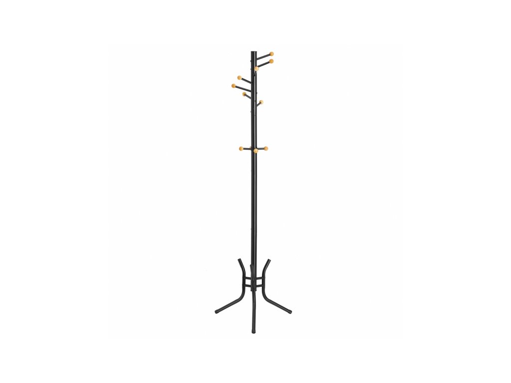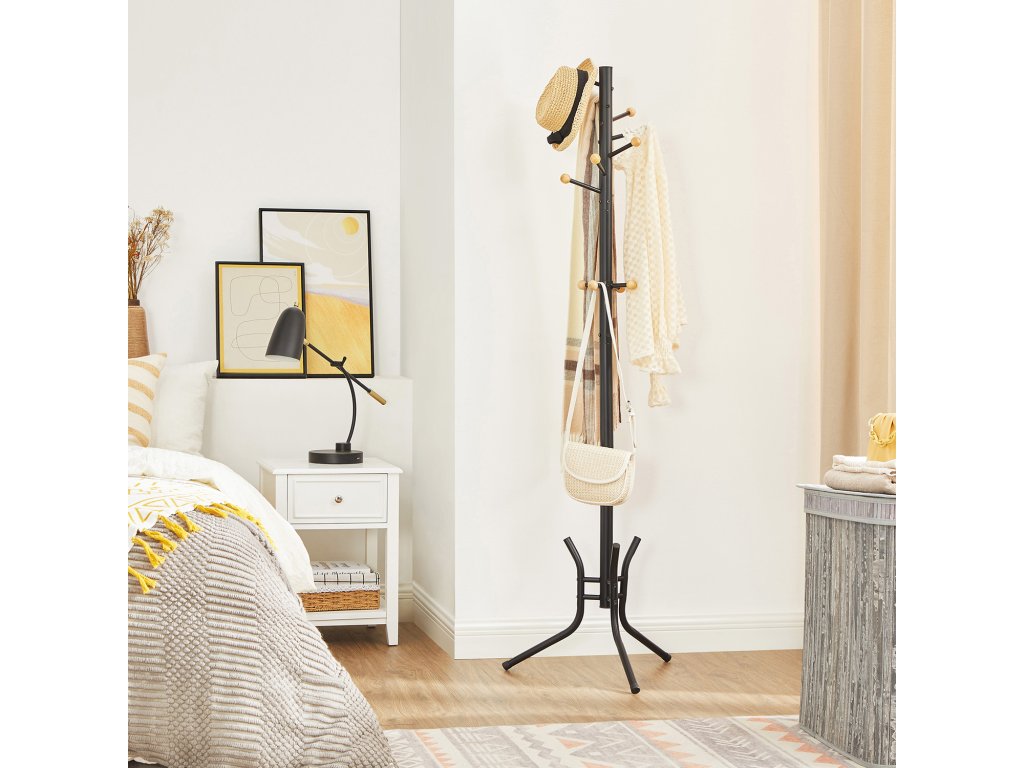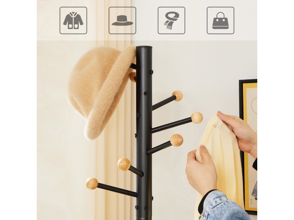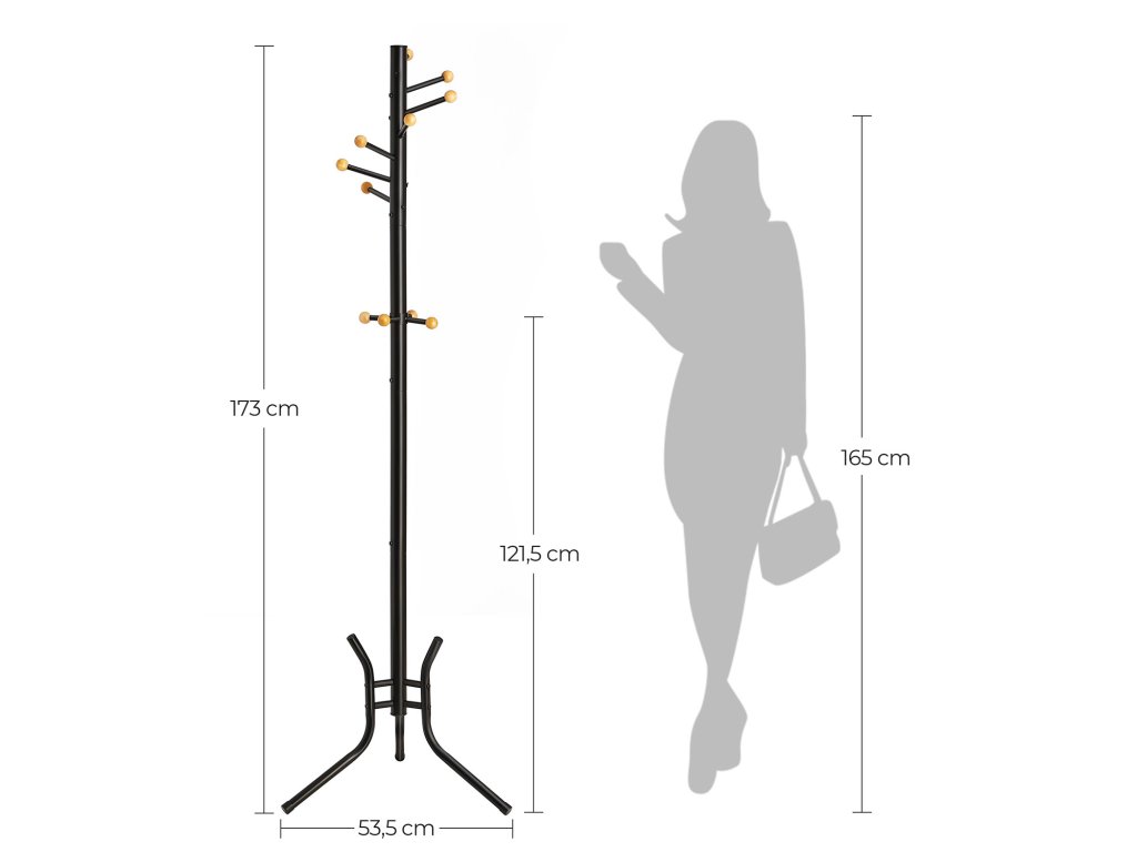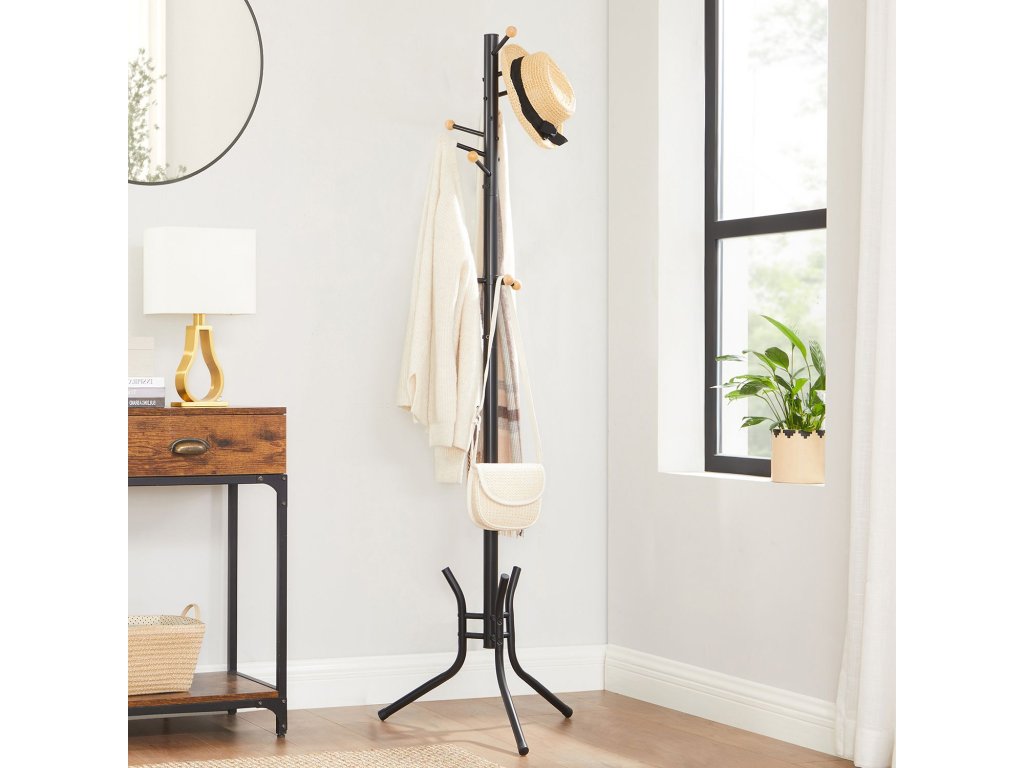 Věšák na kabáty, volně stojící kovový věšák, 11 háčků s dřevěnými konci, na kabáty, klobouky, tašky, 53,5 x 53,5 x 173 cm, černý.