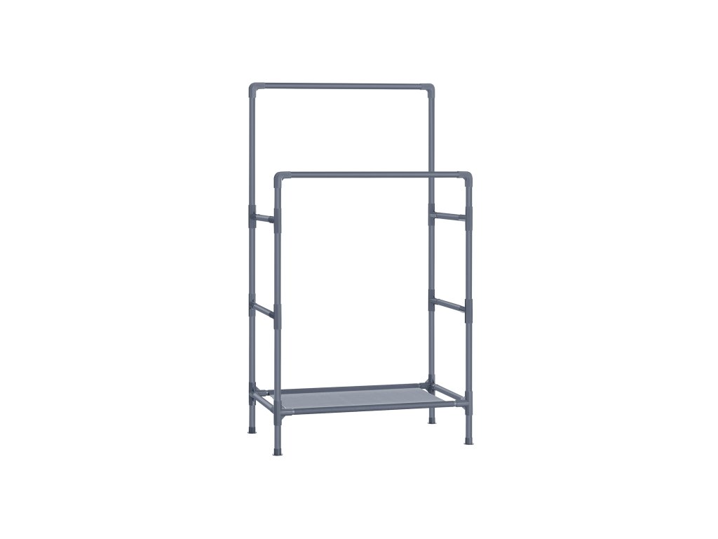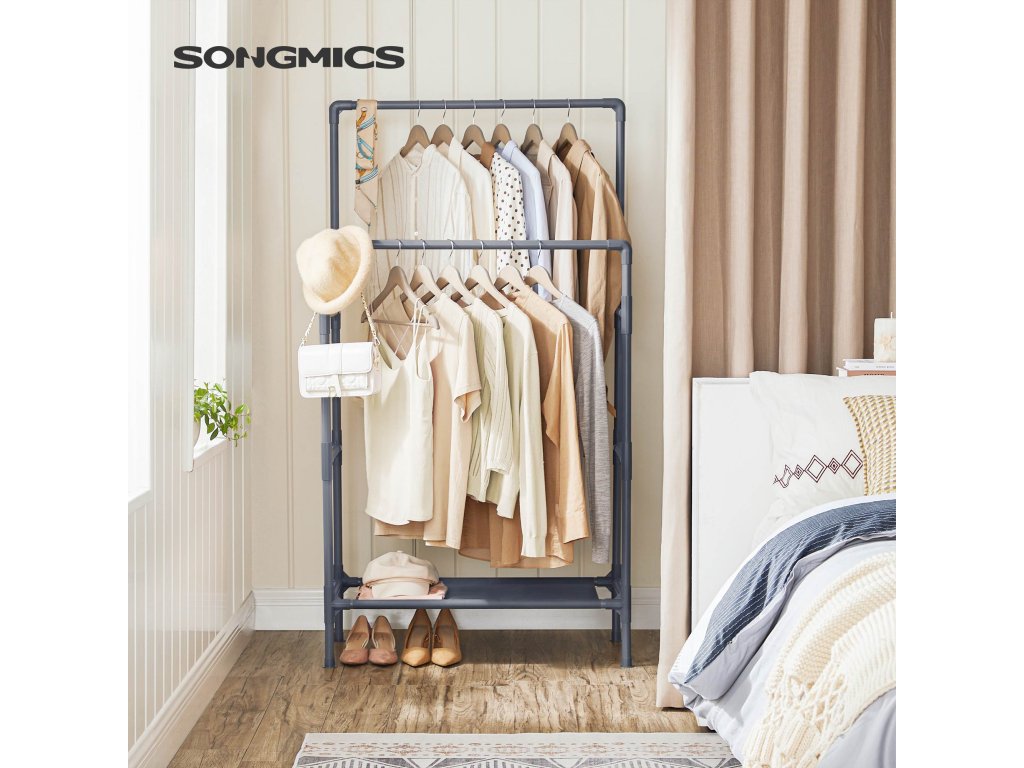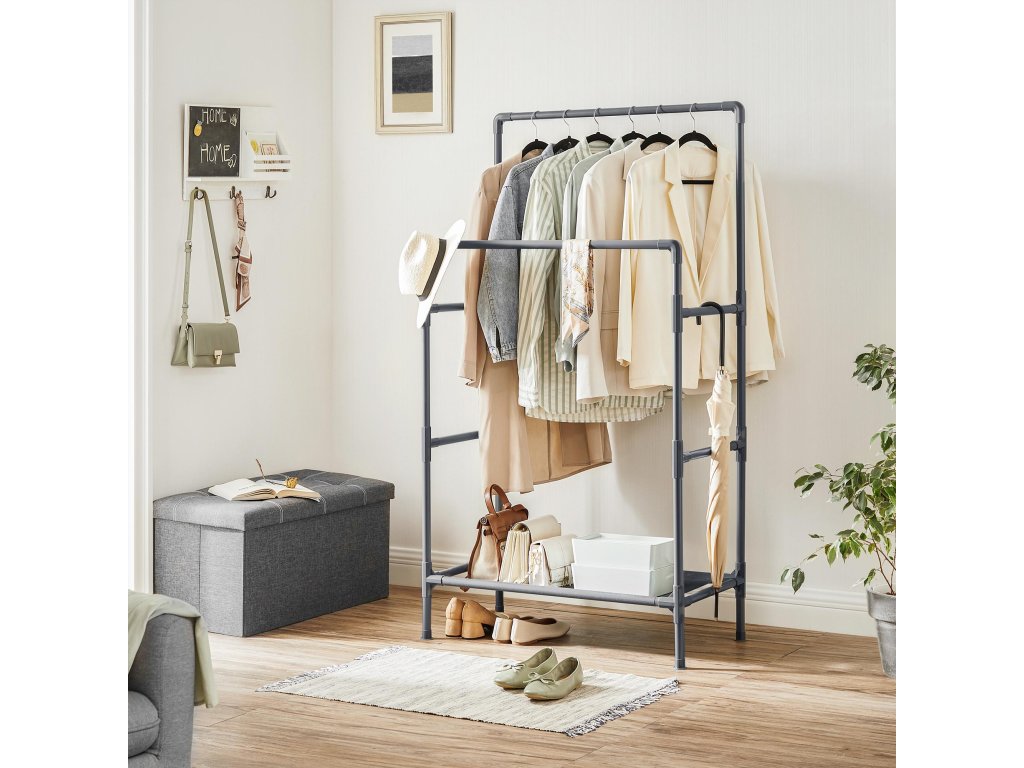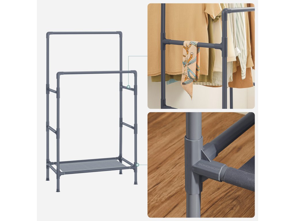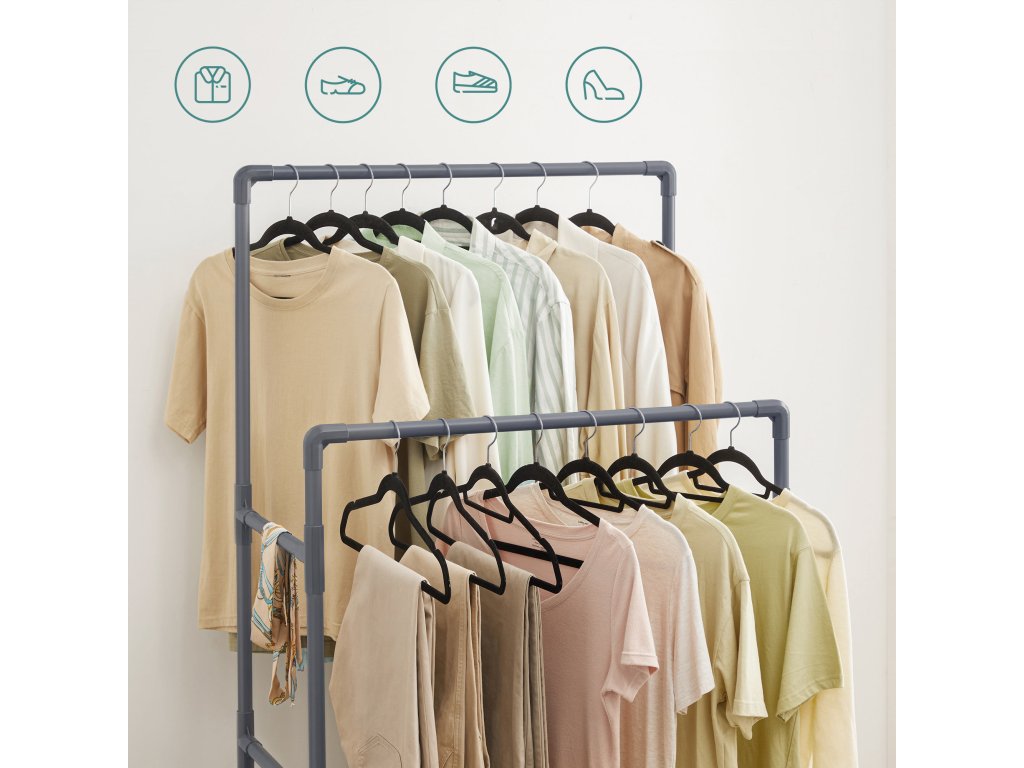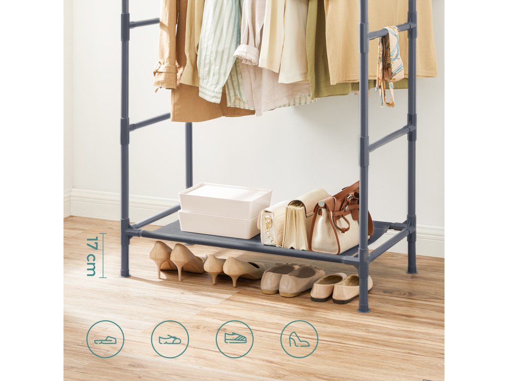 Věšák na oblečení, kovový stojan se 2 závěsnými lištami a odkládací policí, max. Nosnost 55 kg, snadná montáž, šedá.