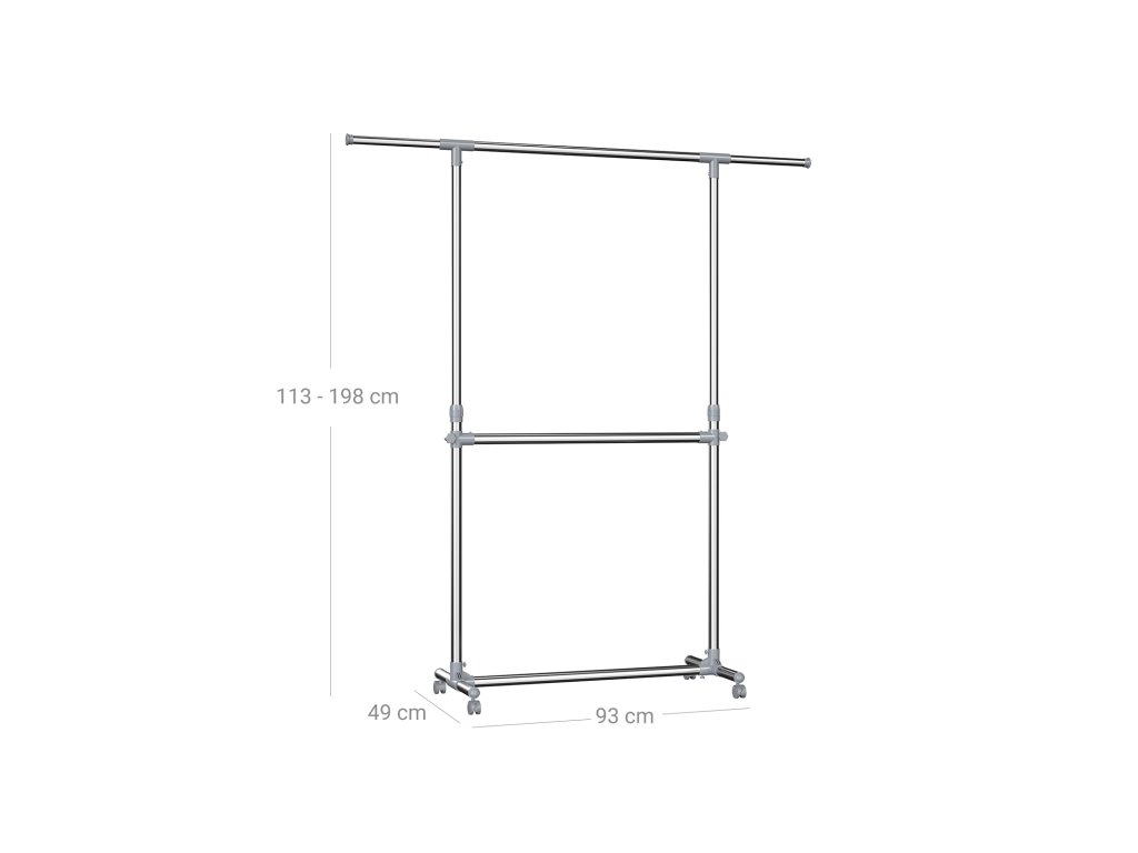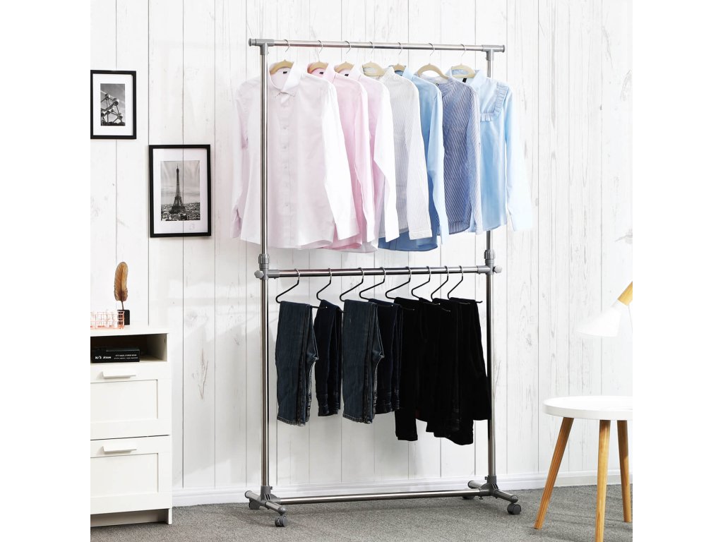 VELVET, SILK, LACE: Oděvy z těchto ušlechtilých materiálů by neměly být jen tak zastrčeny do šatníku. Na tento věšák se 2 tyčemi na šaty je lepší úhledně pověsit obleky, šaty nebo hedvábné halenky.DLOUHÝ, VYŠŠÍ, LEPŠÍ: Výšku stojanu na kabáty lze nastavit v rozmezí 113 až 198 cm a délku v rozmezí 101 až 166 cm. Takto lze věšák přizpůsobit různým místnostem a oděvům různých délek.VYSOKÁ STABILITA: Díky stabilním kovovým trubkám s povrchovou úpravou z nerezové oceli a robustním plastovým konektorům ABS unese každá tyč až 25 kg. Kolečka jsou od sebe vzdálena 49 cm, což zajišťuje dobrou stabilitu.MÁTE PÁR MINUT? Skvělé! Díky jasnému návodu můžete tento stojan na kabáty sestavit za 15 minut.