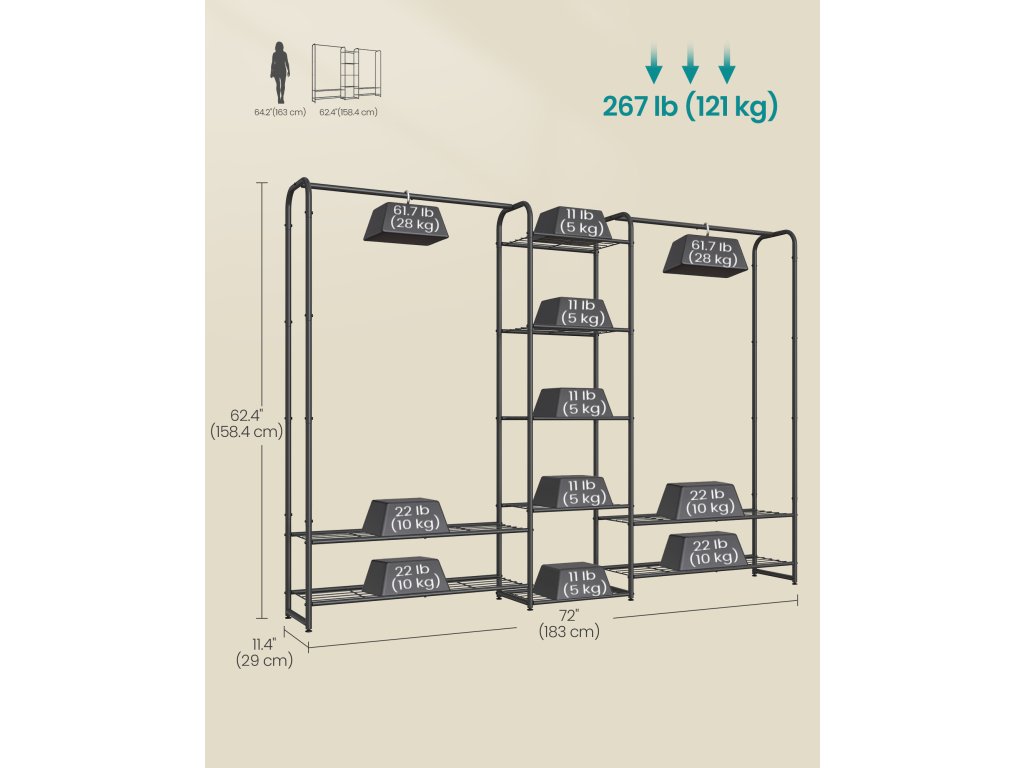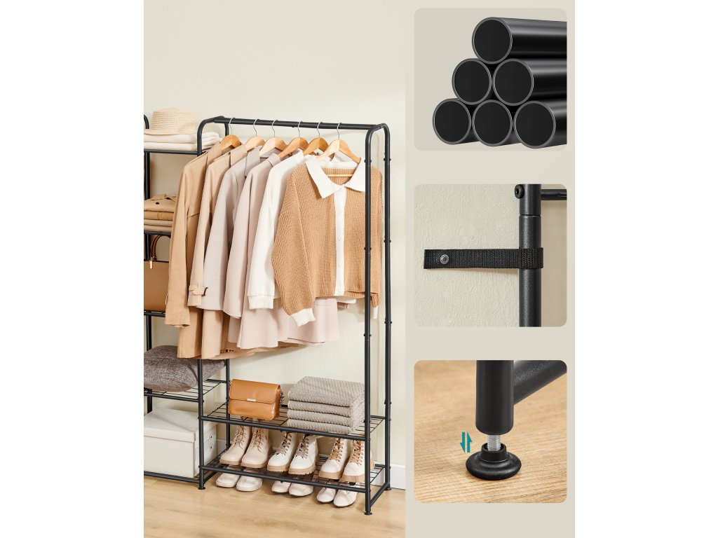【VERSATILNÍ】 Tento věšák nabízí velký prostor pro zavěšení (výška 125 cm), vhodný i pro dlouhé oděvy. 9 polic poskytuje další úložný prostor pro vaše krabice, tašky a další příslušenství. 【Pevný a odolný】Věšák je vyroben ze zesílené oceli, je odolný a udrží i těžké kabáty. Na rozdíl od plastových spojů jsou ocelové trubky spojeny šrouby, které zajišťují stabilní konstrukci. 【OPEN SPACE】Tato otevřená šatní skříň vám umožní na první pohled najít oblečení na celý den a snadno si ho vyzvednout. Stabilní a bezpečná: Díky nastavitelným nožičkám zůstane tento černý věšák vyvážený i na mírně nerovných podlahách. Pro větší bezpečnost můžete věšák připevnit ke zdi pomocí přiložené sady proti převrácení. 【JEDNODUCHÁ MONTÁŽ】Díky jasnému návodu, označeným dílům a přiloženému imbusovému klíči lze tento věšák sestavit během chvilky, což vám ušetří čas i námahu.