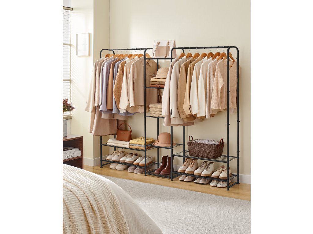 Věšák na oděvy, otevřená šatní skříň, tyč na oděvy, věšák na oděvy s úložnými policemi, kovová šatní skříň, volně stojící, matná černá.