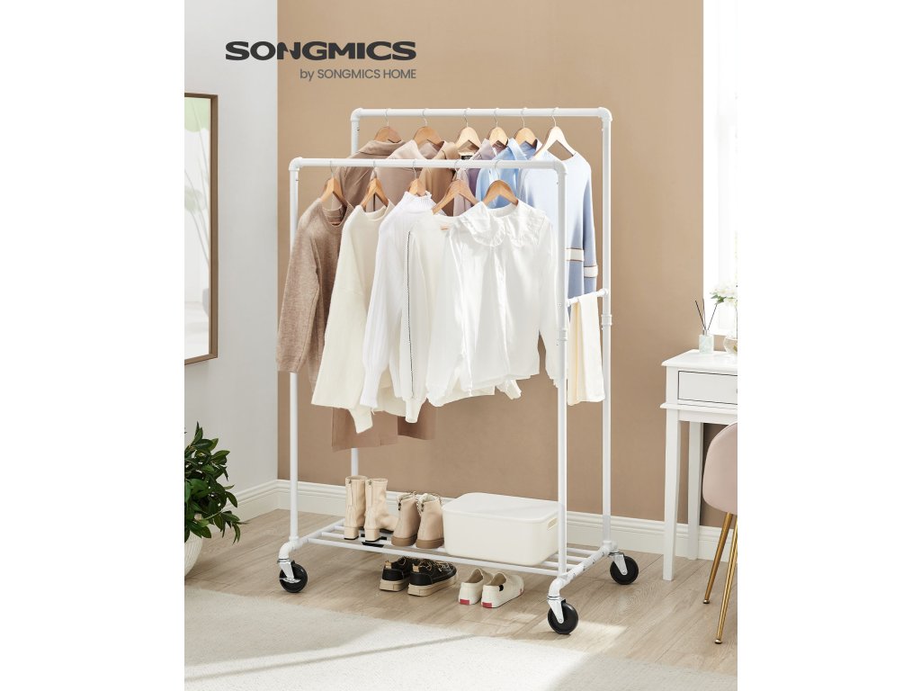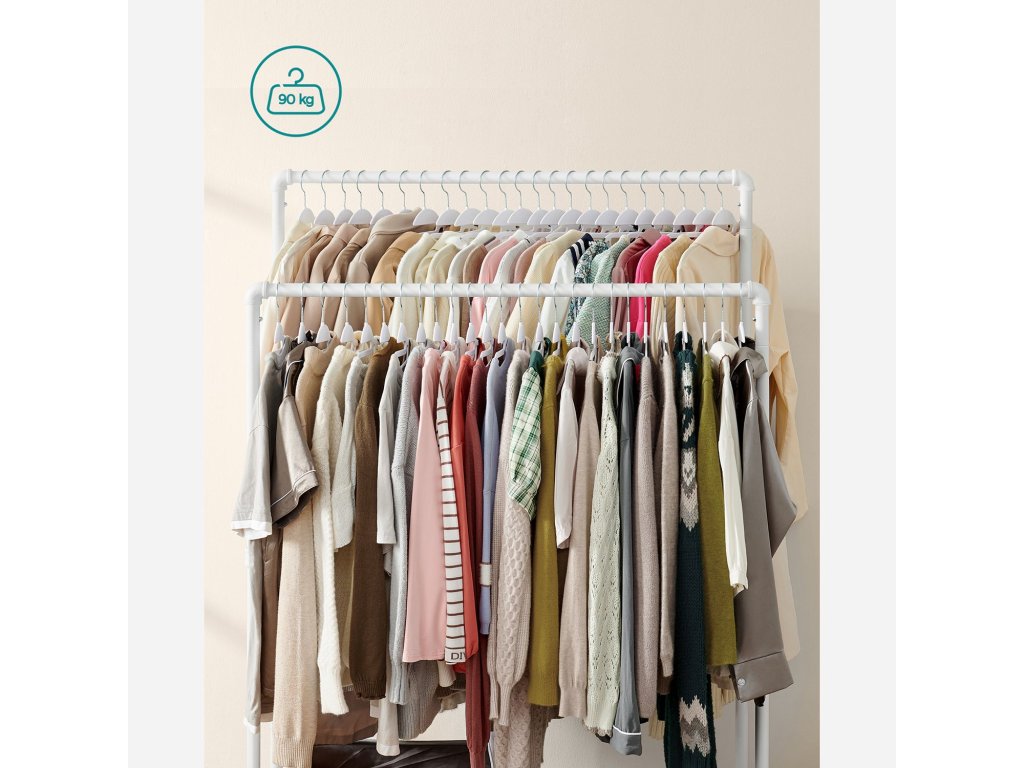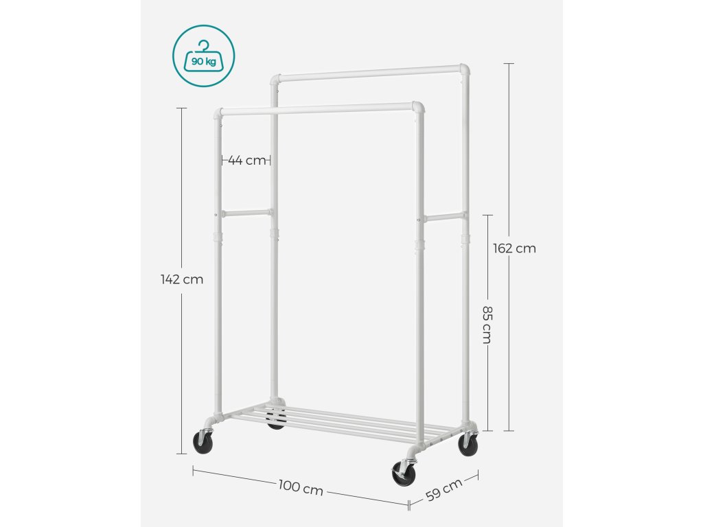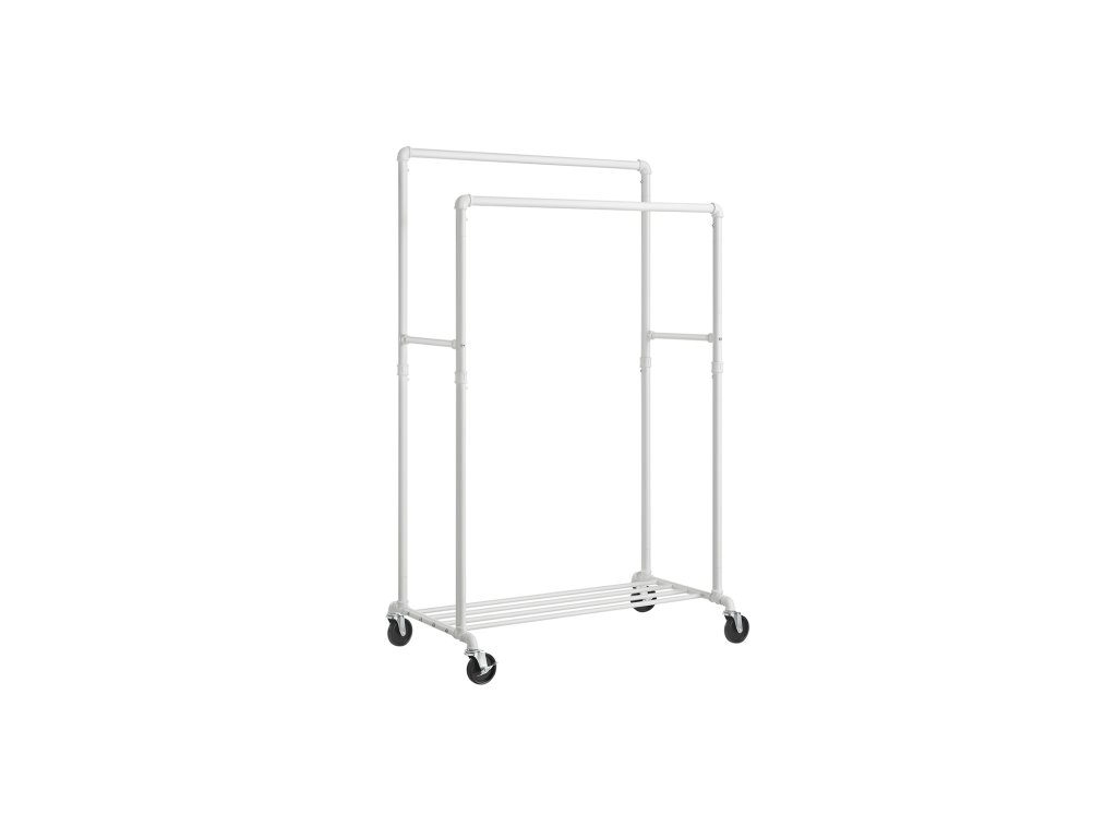 Věšák na oděvy, stojan na oděvy s dvojitou závěsnou lištou, kolečka, odkládací police, maximální zatížení 110 kg, průmyslový styl, do ložnice, šatny bílá.