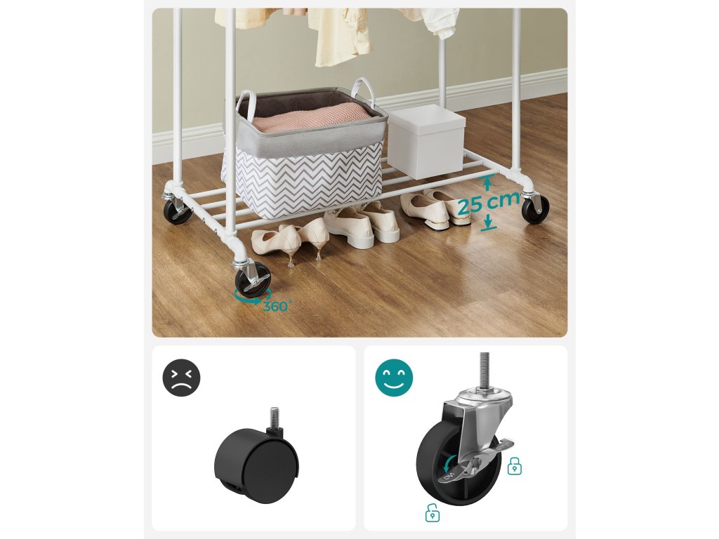 Elegantní průmyslový styl: Nezáleží na tom, zda máte chladný rustikální byt nebo minimalistický domov. tento módní věšák na oblečení inspirovaný industriálními prvky bude výrazným prvkem, který ukáže vaše krásné oblečení a rozšíří úložný prostor v ložnici nebo prádelně.Robustní a odolné: Prémiové ocelové trubky zajišťují vynikající pevnost a stabilitu. Ať už máte zimní bundy nebo elegantní koktejlové šaty, tento těžký věšák na oblečení je všechny udrží až do celkové nosnosti 110 kg.Snadné stěhování nebo pobyt: 4 univerzální kvalitní kolečka tohoto věšáku na oděvy nabízejí snadnou mobilitu z jednoho místa na druhé. Chcete-li jej udržet na místě? Jistě! 2 z těchto koleček jsou vybavena brzdami, které tento trik zvládnou.Spousta úložného prostoru: Na 2 závěsné lišty, které jsou od sebe vzdálené 44 cm, můžete zavěsit oblečení, abyste snadno našli, co potřebujete, šátky a kravaty na prostřední příčné tyče. a boty nebo tašky si dejte na spodní polici - všechno tu má své místo!Co získáte: Dvoukolejnicový kovový věšák na oděvy na kolečkách, který udrží vaše oblečení a doplňky uspořádané a snadno přístupné, a také očíslované díly a jasné pokyny pro snadnou montáž.| Kategorie: | Stojany na oblečení |