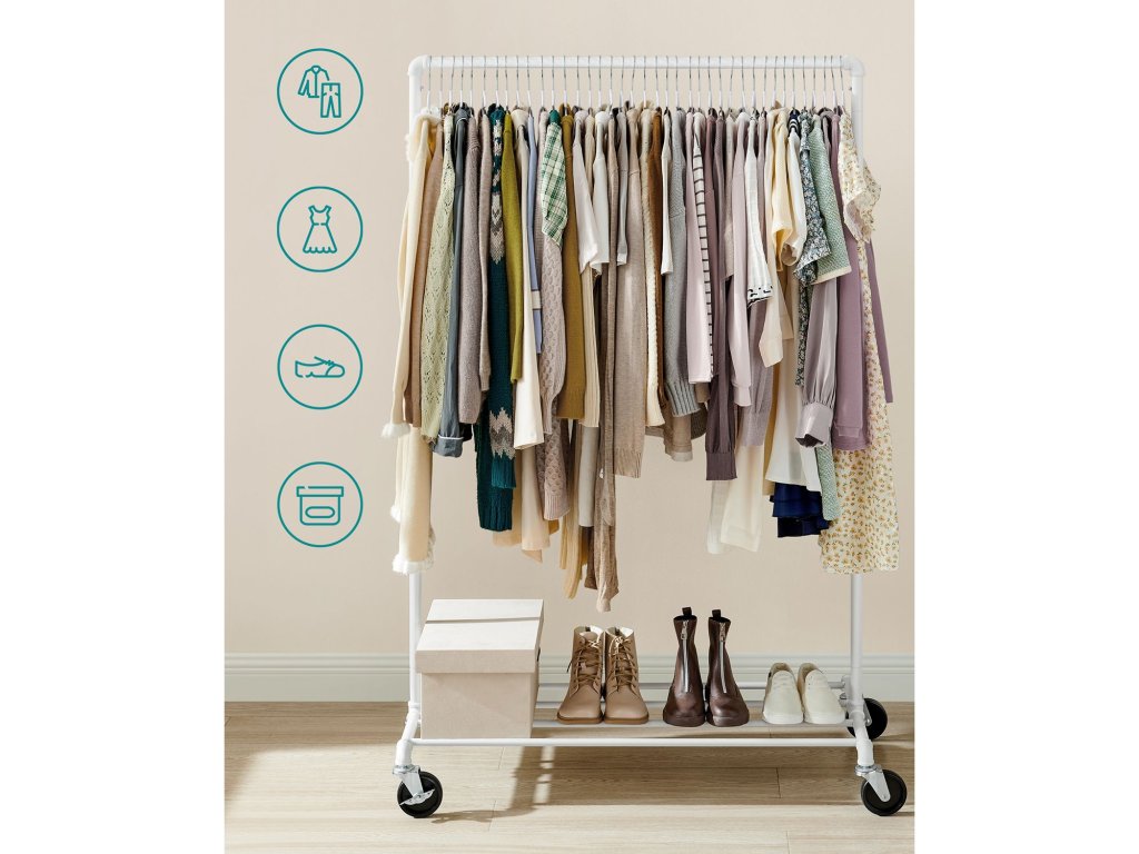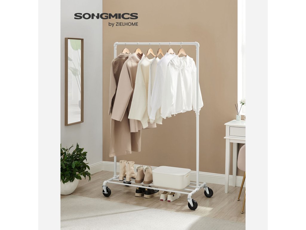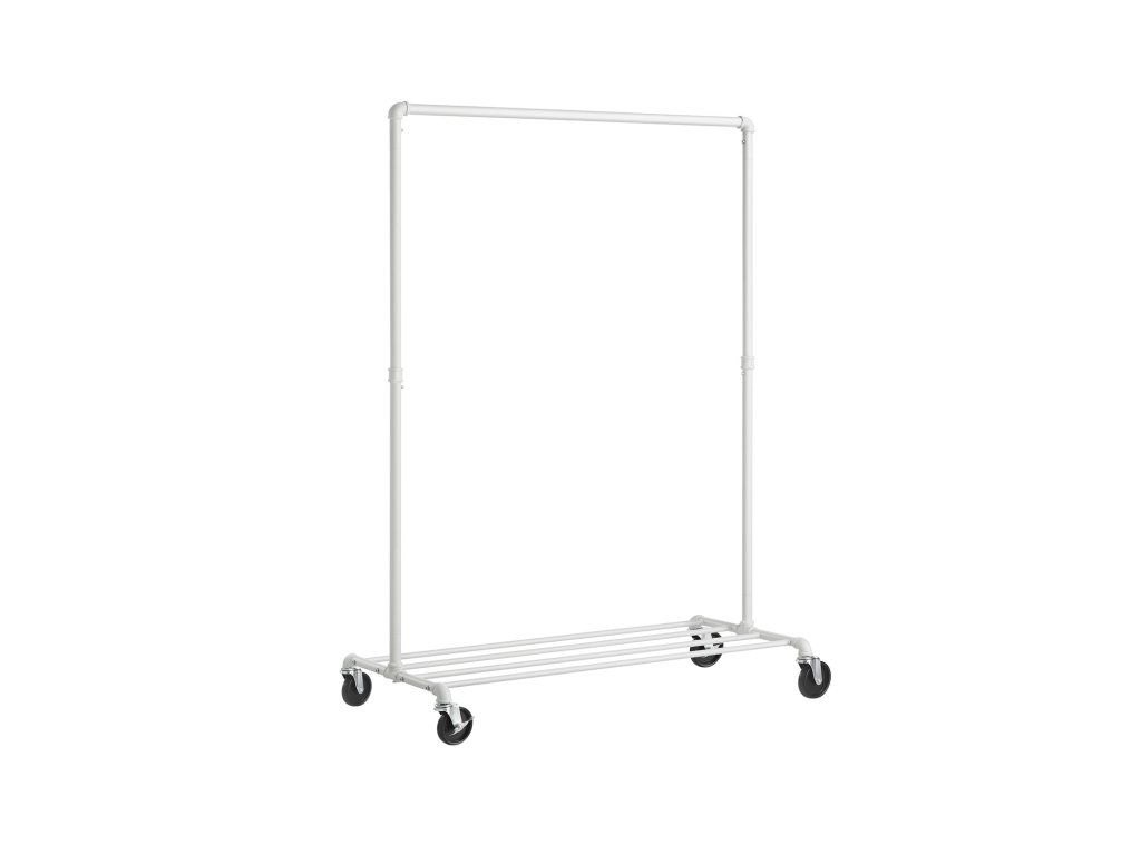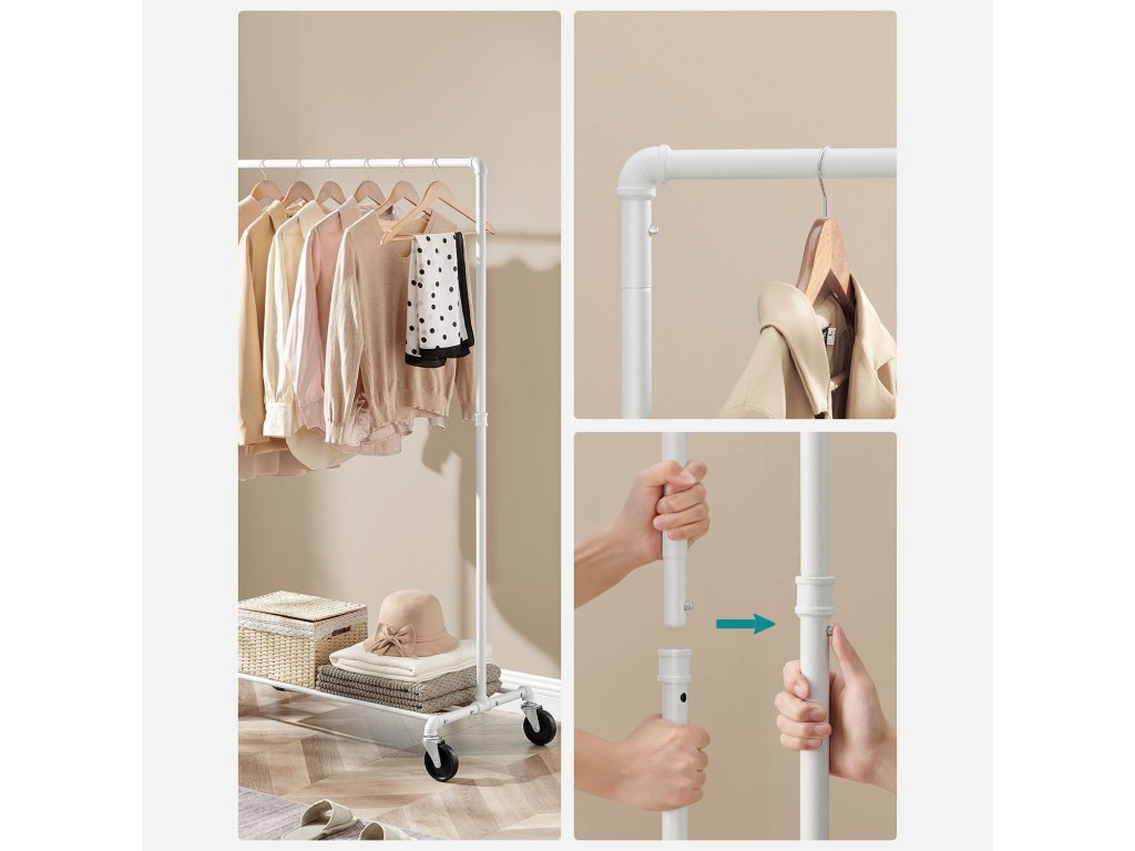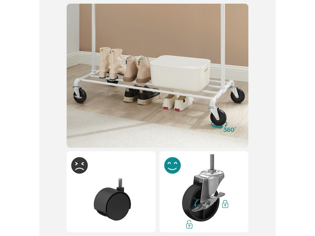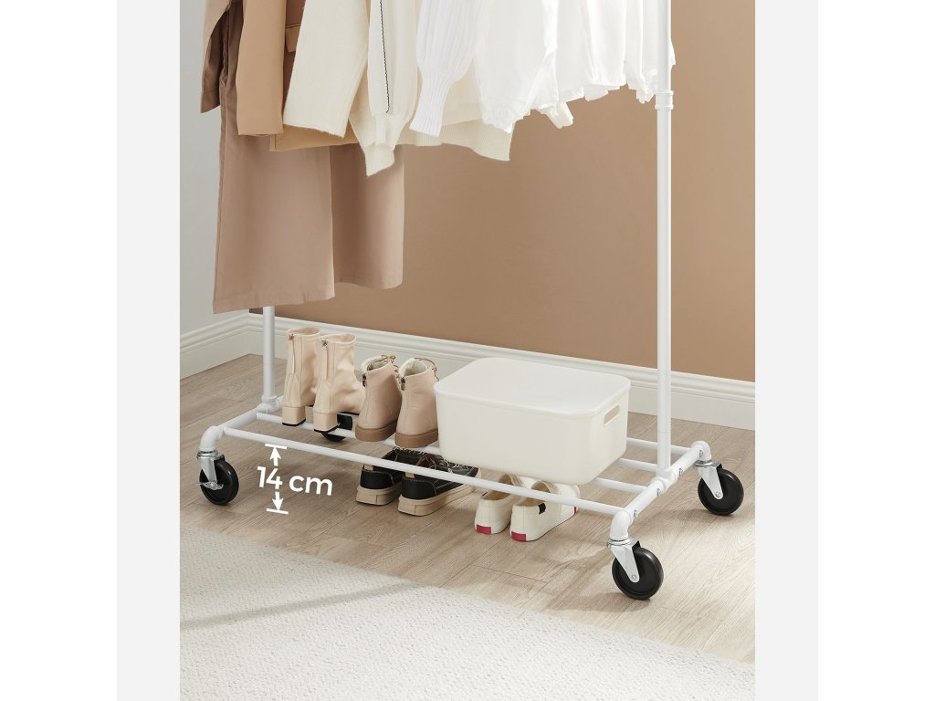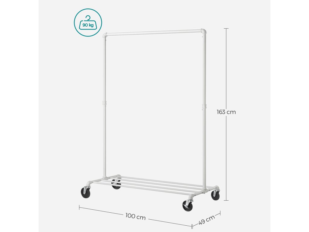 Věšák na oděvy, věšák na kolečkách, věšák na oděvy s vysokou nosností, nosnost 90 kg, průmyslový design, stojan na kabáty s 1 závěsnou lištou a policí, do ložnice a prádelny, bílý.