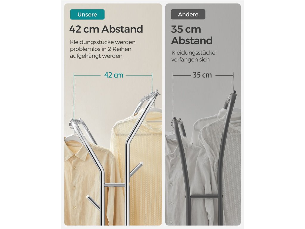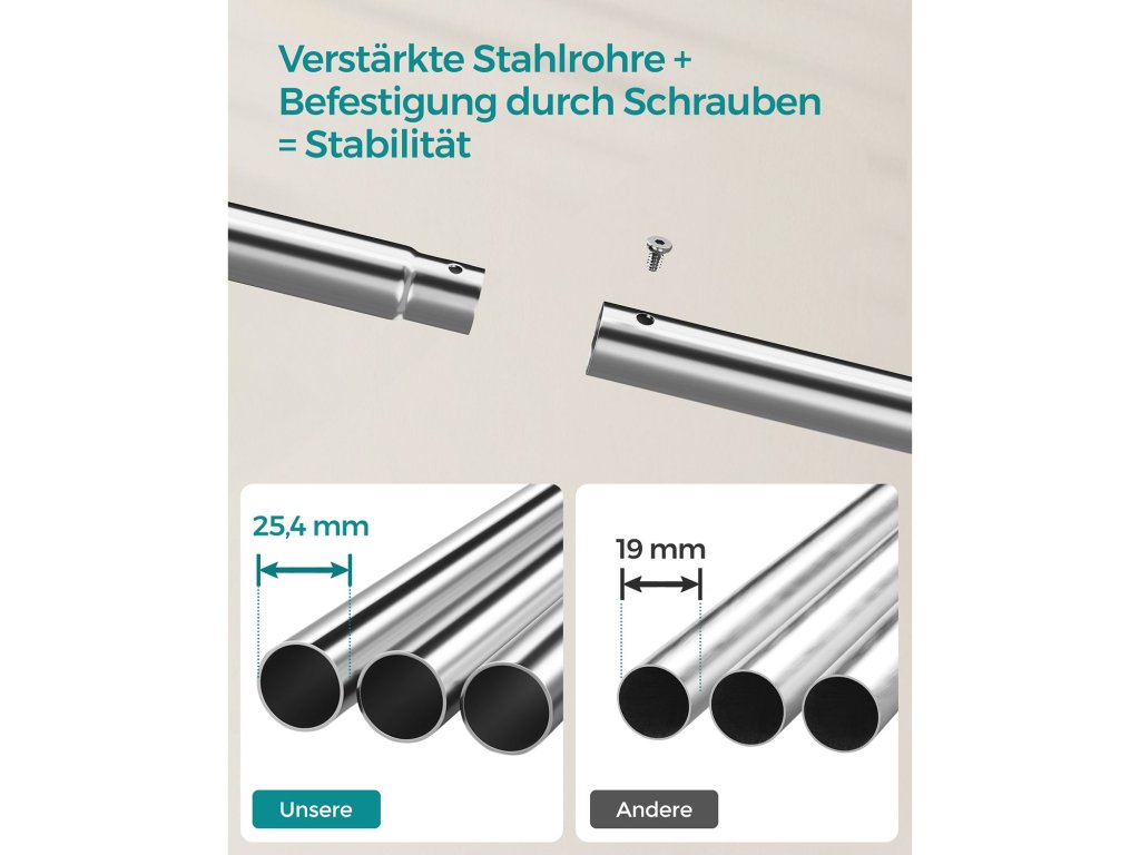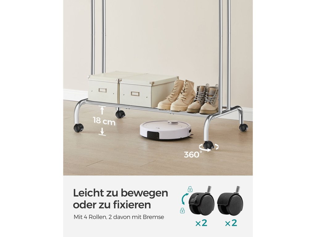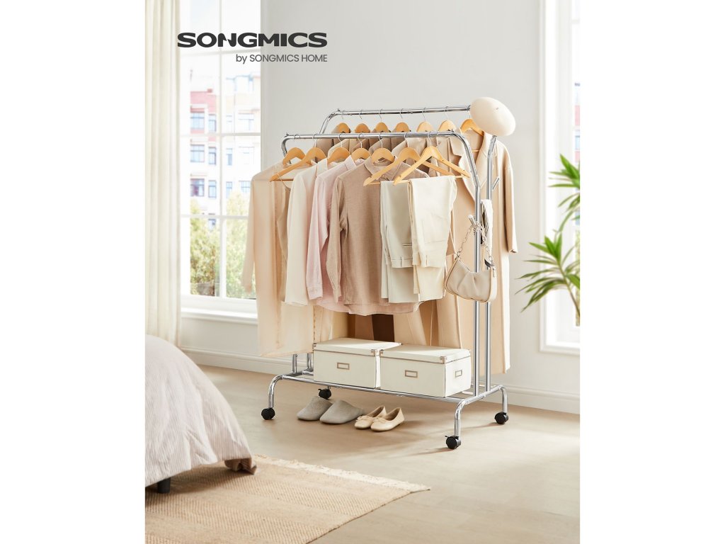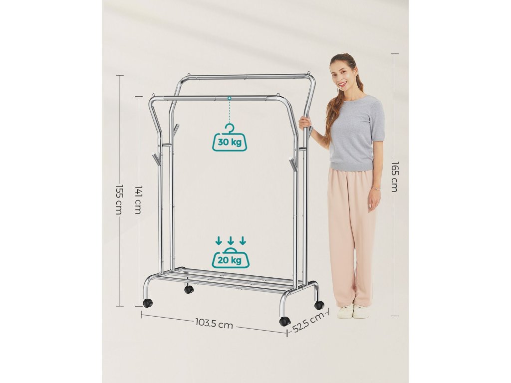 Všestranný úložný prostor S vysokou a nízkou kolejnicí pro zavěšení oděvů různých délek, háčky na obou stranách pro tašky a klobouky a spodní policí pro krabice a boty. tento věšák na oblečení uchovává všechny vaše potřeby na jednom místě.Rychlé sušení a snadný přístup Rozteč 42 cm mezi 2 kolejnicemi pro zavěšení oděvů umožňuje snadné proudění vzduchu, což podporuje rychlé sušení. Nabízí dostatek prostoru pro zavěšení, aby se zabránilo přeplnění a nepořádku v oblečení, a usnadňuje tak přístup k němu.Snadné přemístění a uzamčení Díky 4 otočným kolečkům můžete dvojitý věšák na oblečení bez námahy přemístit do kterékoli místnosti v domě. Dvě z koleček jsou uzamykatelná, takže můžete věšák také udržet na jednom místě.Stabilní a pevný Díky šroubům, které zajišťují 25,4 mm silné ocelové trubky, má tento stojan na oblečení stabilní rám, který unese až 100 kg. Každá kolejnice má maximální statickou nosnost 30 kg; každý háček až 5 kg a spodní police pojme až 20 kg;Snadná montáž Díky jednoduché konstrukci, očíslovaným dílům a ilustrovaným a snadno čitelným návodům je sestavení tohoto odolného věšáku na oděvy hračkou.| Kategorie: | Stojany na oblečení |