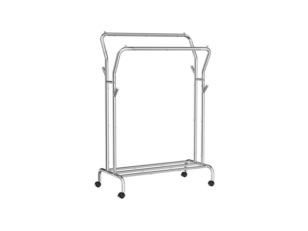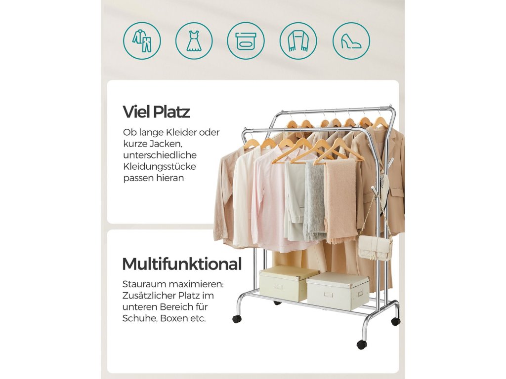 Věšák na oděvy, věšák na oděvy, dvojitý věšák na oděvy, odolný kovový rám, s kolečky a policí, celková max. nosnost 100 kg. šířka 103,5 cm, úložný prostor na oděvy, stříbrná.