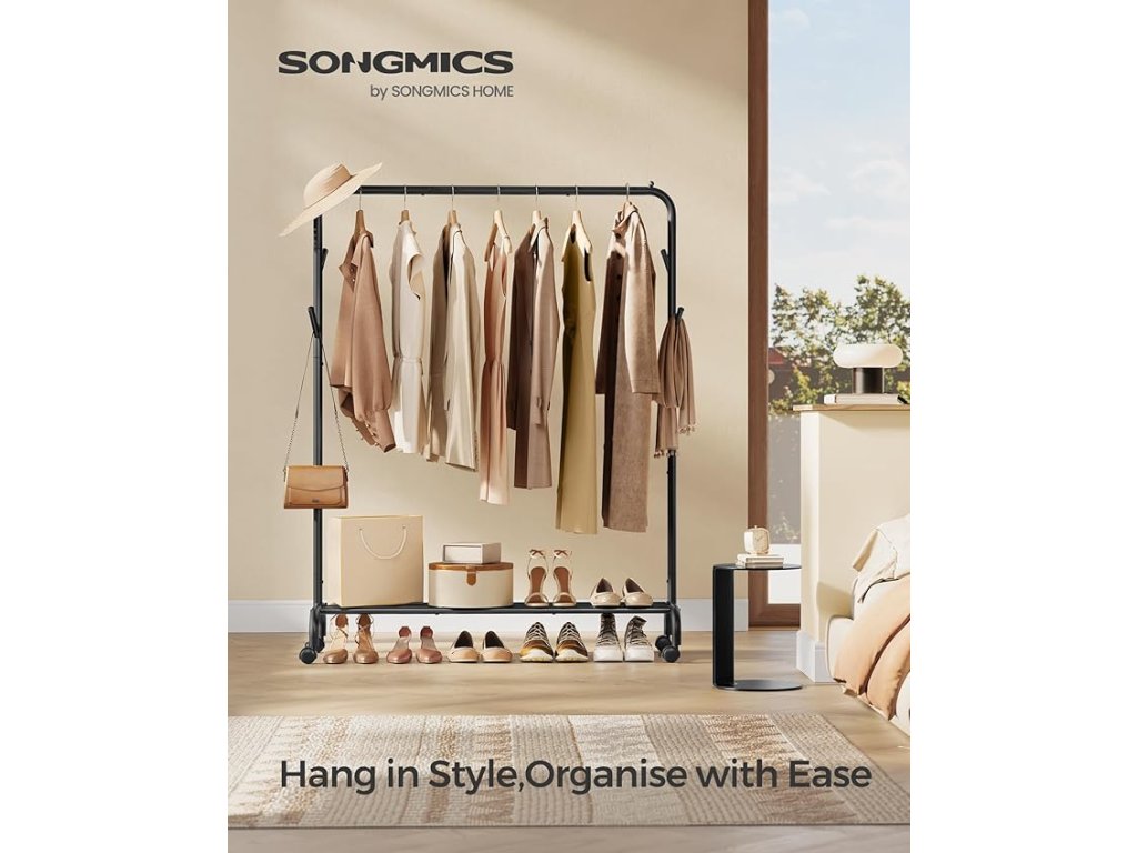 【STATNÝ A PEVNÝ】 Tento stojan na oděvy má stabilní rám, který unese až 50 kg, a to díky šroubům upevňujícím ocelové trubky o tloušťce 22 mm. Každá kolejnice má maximální statickou nosnost 25 kg; každý háček až 2,5 kg a spodní police pojme až 15 kg;