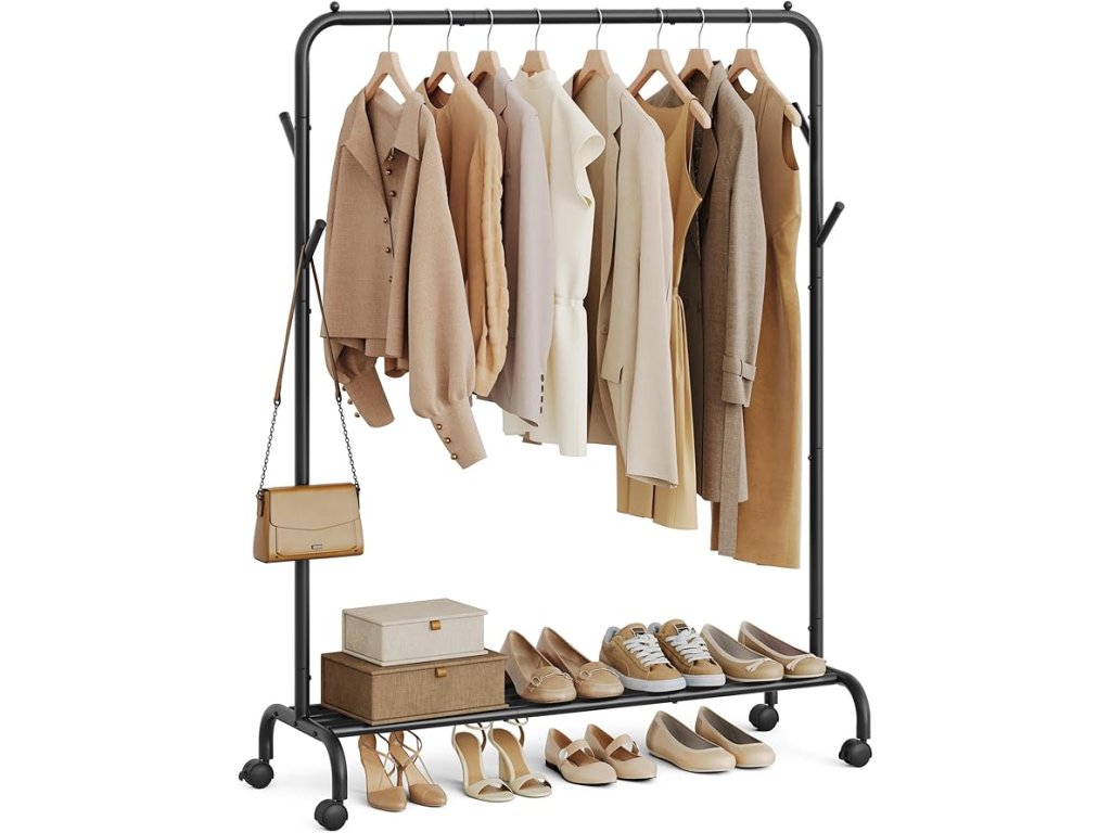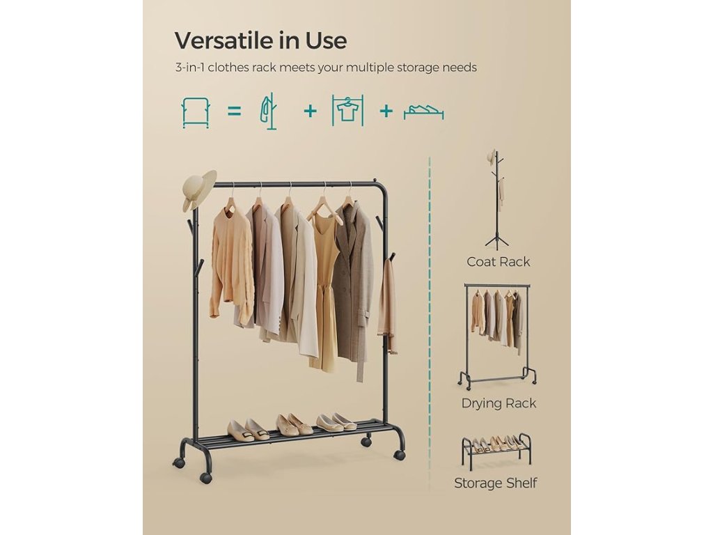 【Všestranný úložný prostor】S vysokou lištou pro zavěšení oděvů různých délek, háčky na obou stranách pro tašky a klobouky a spodní policí pro krabice a boty. tento věšák na oblečení uchovává všechny vaše potřeby na jednom místě.