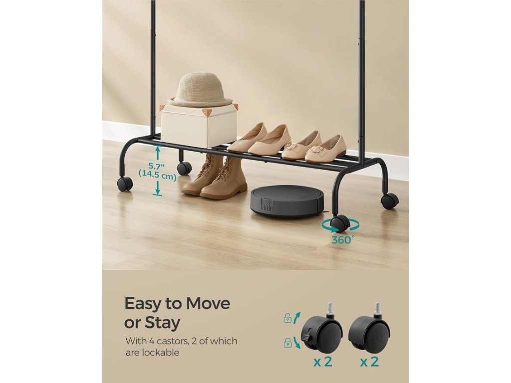 【Jednoduché přemisťování a zamykání】Díky 4 otočným kolečkům můžete dvojitý věšák na oděvy snadno přemístit do kterékoli místnosti v domě. Dvě z koleček jsou uzamykatelná, takže můžete věšák také udržet na jednom místě.