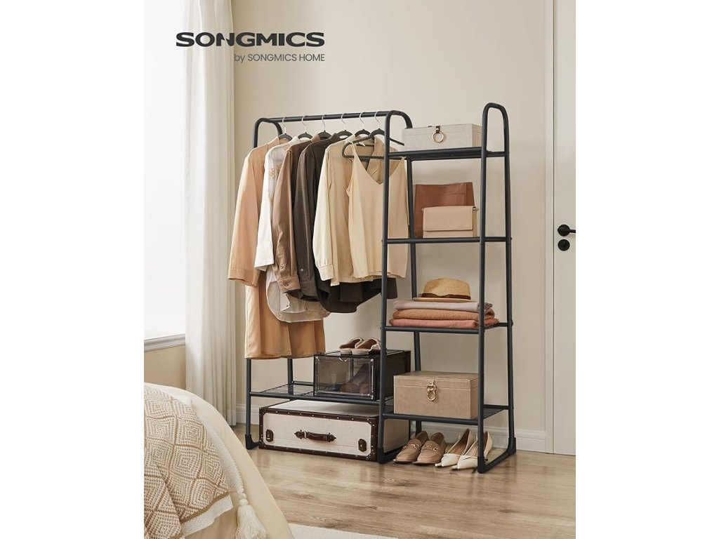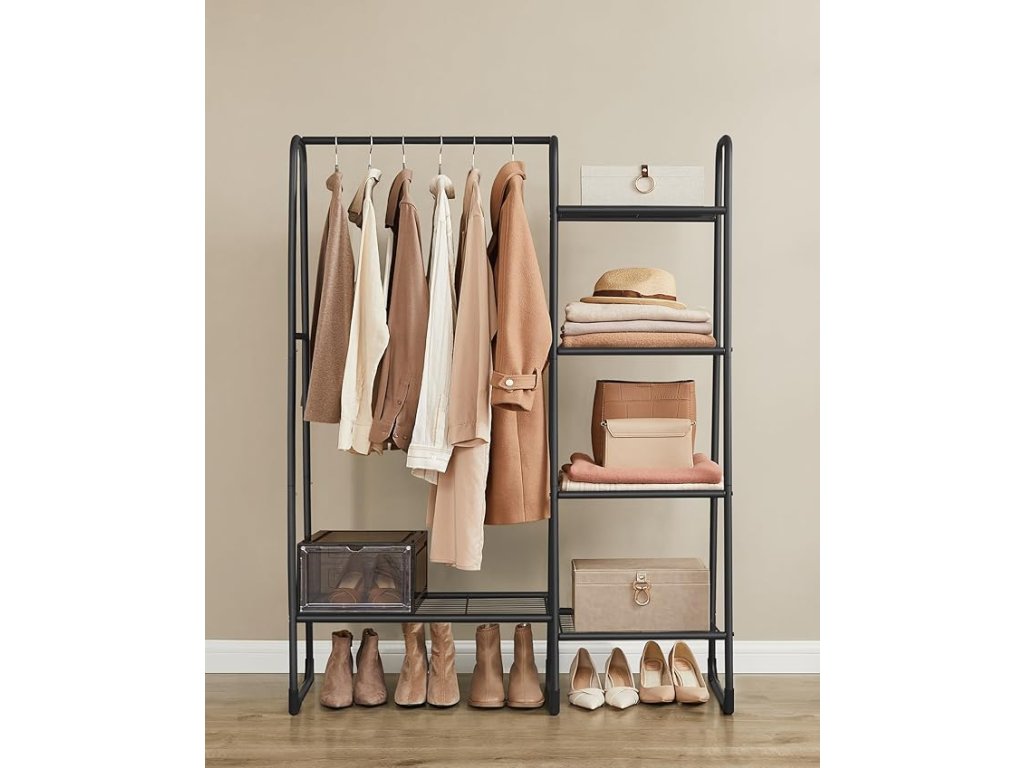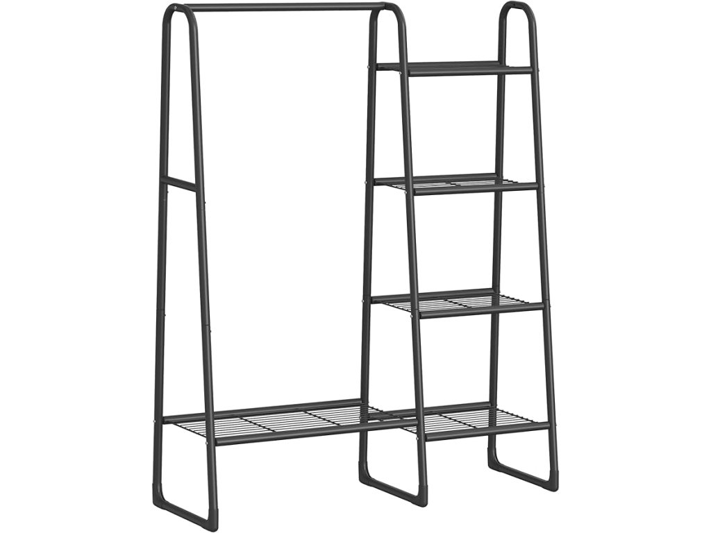 Věšák na oděvy, volně stojící, 5 úložných polic, kovový rám, 40 x 101,7 x 153,3 cm, ložnice, obývací pokoj, předsíň, matná černá.