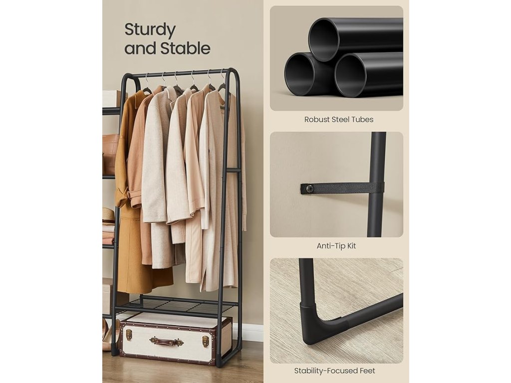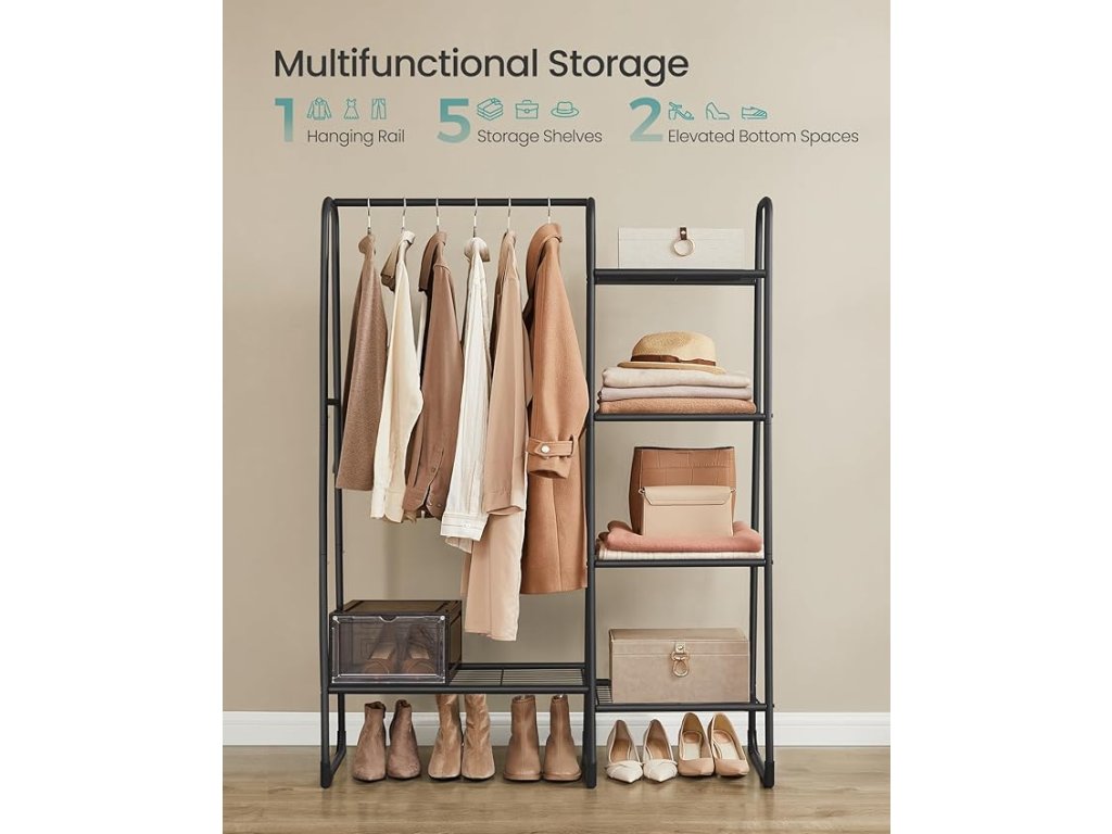 【VÍCEFUNKČNÍ VĚŠÁK NA ODĚVY】 Tento věšák na oděvy kombinuje závěsnou lištu a úložné police, které umožňují uspořádat oděvy, tašky, doplňky a boty na jednom místě. usnadňuje rychlé nalezení potřebných informací