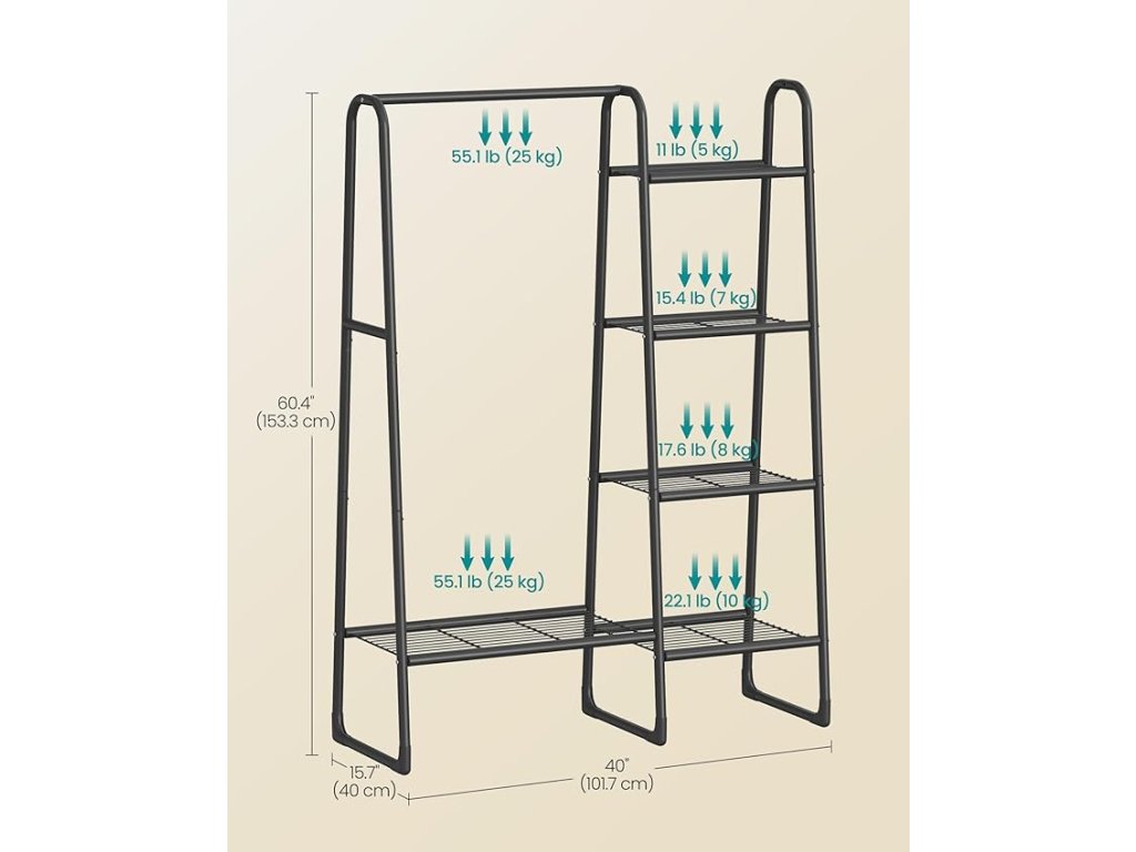【DOSTATEČNÝ OTEVŘENÝ ÚLOŽNÝ PROSTOR】 Tento věšák na oblečení o rozměrech 40 x 101,7 x 153,3 cm nabízí spoustu otevřeného úložného prostoru pro vaše věci a dostatek vertikálního prostoru pro zavěšení dlouhých kabátů. usnadňuje přípravu v hektických ránech.
