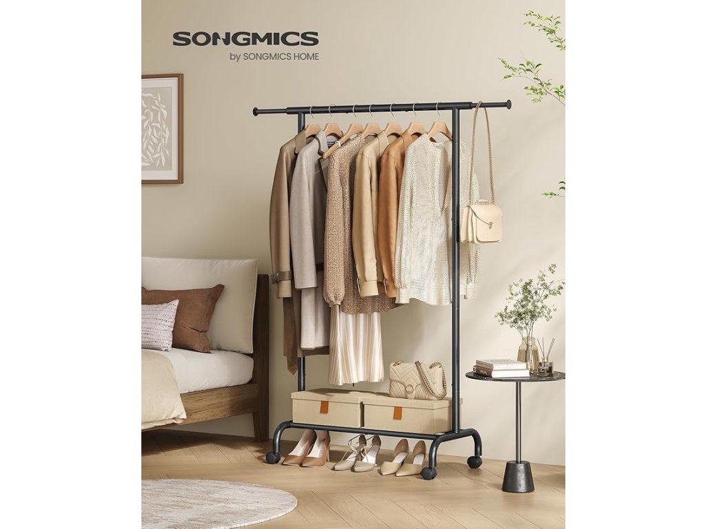 【JEDNODUCHÉ PŘEMÍSTĚNÍ】 Tento stojan na kabáty má čtyři kolečka otočná o 360°, z nichž dvě mají brzdy pro aretaci, takže jej můžete snadno přemístit z ložnice do šatní skříně nebo kamkoli potřebujete.