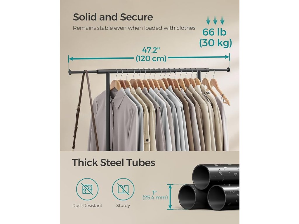 【 ROZŠÍŘITELNÝ A FLEXIBILNÍ】Každý konec závěsné lišty lze prodloužit o 18,5 cm (šířka věšáku na oblečení: 83-120 cm), takže se dokonale hodí do různých prostor. a zároveň nabízí další úložný prostor pro tašky, klobouky, šály a další doplňky.【PRAKTICKÝ DOLNÍ ÚLOŽNÝ PROSTOR】 Kromě výsuvné lišty pro snadné zavěšení oděvů je tento věšák vybaven dvěma dolními tyčemi, které vytvářejí úložný prostor. vhodné pro ukládání krabic a košů