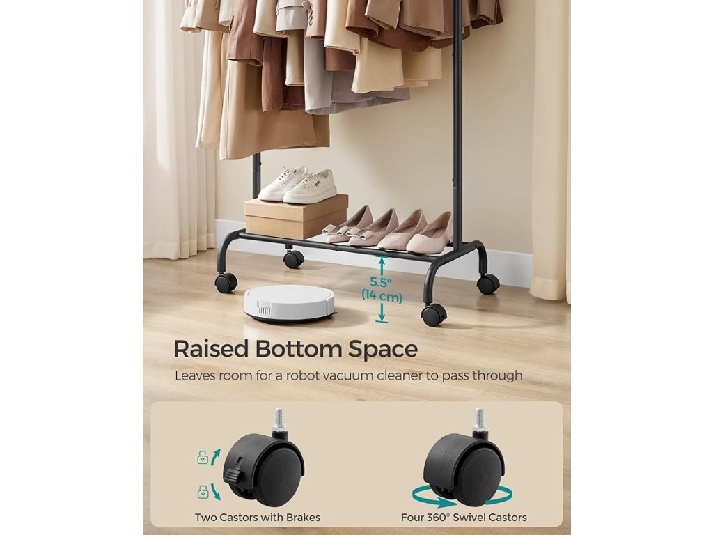 【Zvýšené spodní tyče】2 spodní tyče se nacházejí 14 cm nad podlahou, takže pod nimi zůstává dostatek prostoru pro uložení bot a snadný průchod pro robotický vysavač.