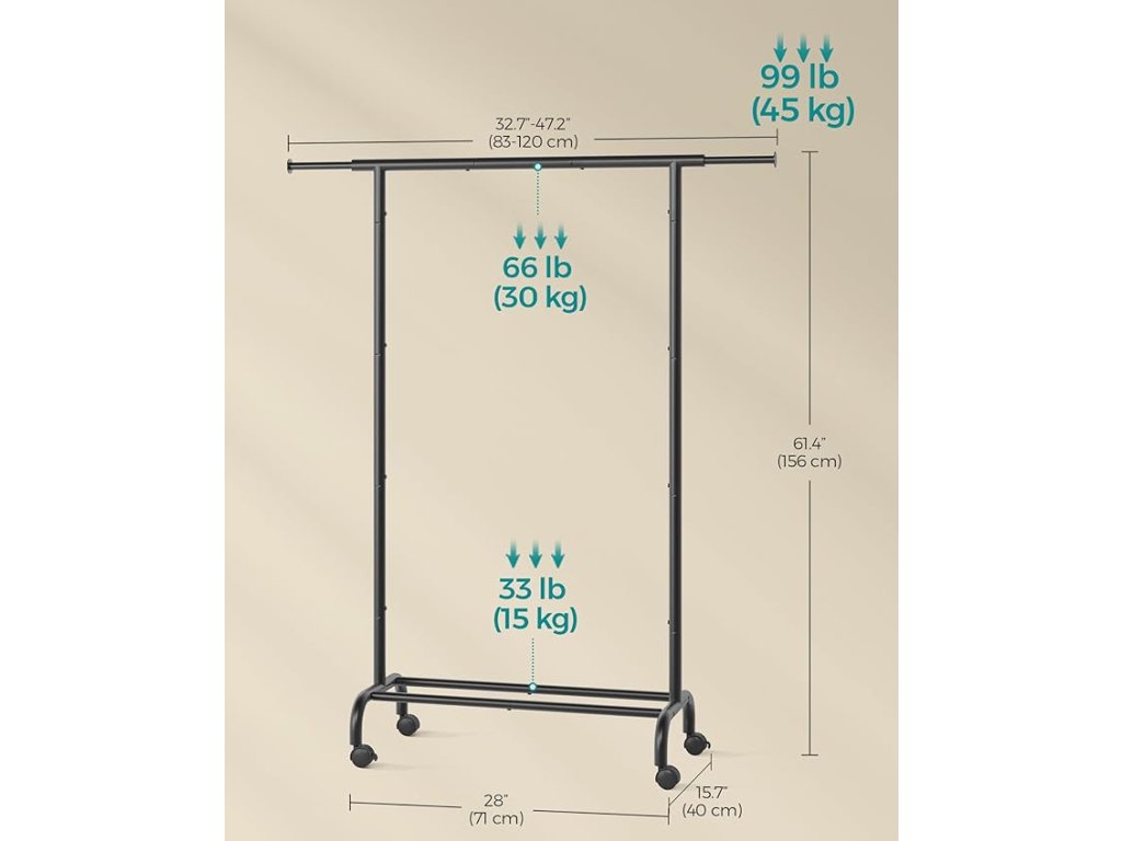 Věšák na oděvy, výsuvný věšák, úložný prostor na oděvy s kolečky, max. 45 kg. zatížení, 40 x (83-120) x 156 cm, inkoustově černá.