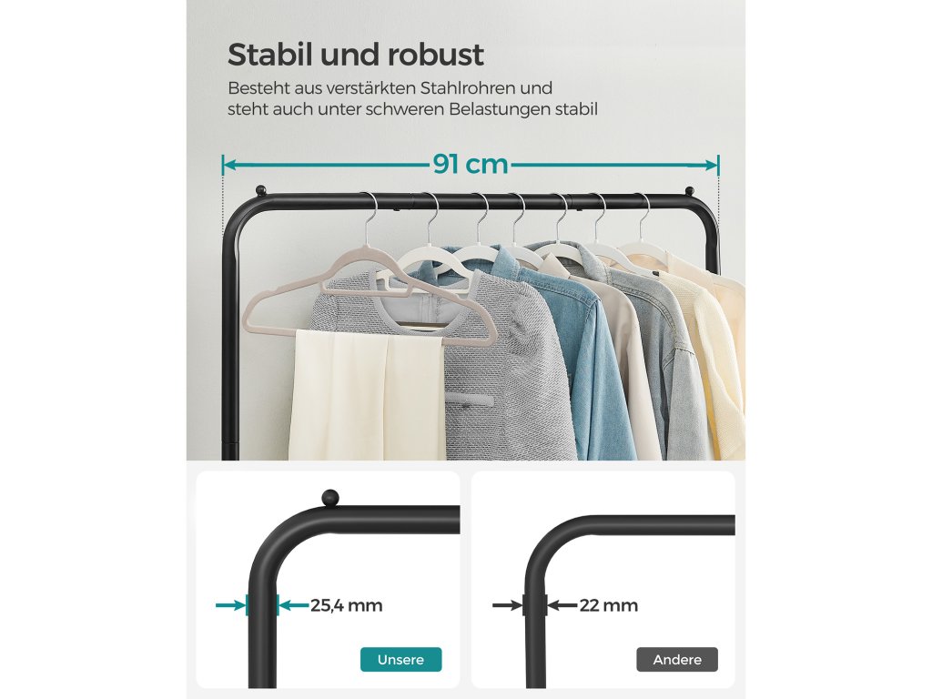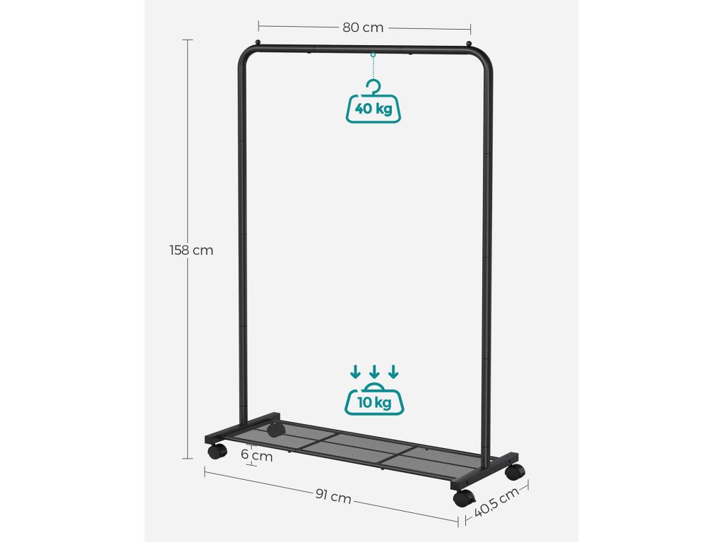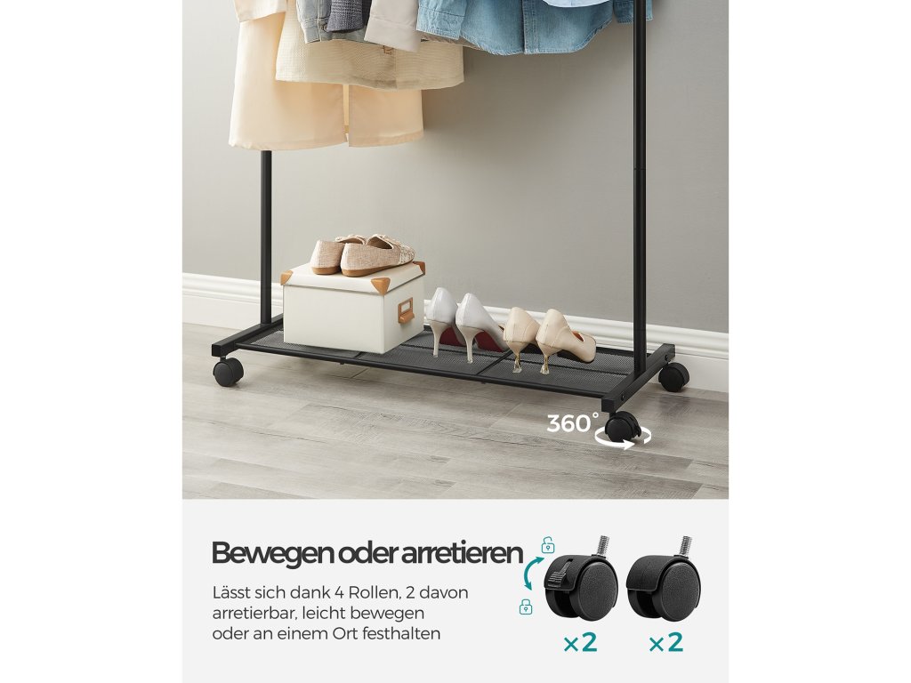 NEBOJUJTE S PROSTOREM ŠATNÍKU: Šatní skříň praská ve švech? Nebo vůbec žádná skříň? Stačí si domů přinést tento věšák na oděvy, abyste měli v oblečení větší pořádek.JEDNODUCHÝ, ALE SILNÝ: robustní ocelové trubky tohoto věšáku na oblečení jsou na rozdíl od těch s běžnou strukturou se zacvakávacími knoflíky spojeny šrouby. zajišťuje vyšší stabilitu a velkou nosnost - horní kolejnice unese až 40 kg.JAKO POJÍZDNÁ SKŘÍŇ: Co si vzít na večírek - běžné oblečení, malé černé šaty nebo elegantní overal? Jednoduše přetočte tento stojan na oblečení s kolečky k zrcadlu a najděte to správné oblečení; 2 brzdy ji udrží na místě;LADIT S OBUVÍ: Díky spodní síťované polici, která pojme až 10 kg, si můžete připravit vhodné boty k oblečení na příští týden a doplnit tak svůj vzhled. Síťovina je hustá takže i vaše vysoké podpatky si zde najdou své místo.CO ZÍSKÁTE: Snadná montáž, 2 tyče na koncích horní lišty, které chrání oblečení před pádem. a jednoduchý způsob, jak obnovit pořádek ve skříni a zároveň si pořídit více oblečení.| Kategorie: | Stojany na oblečení |