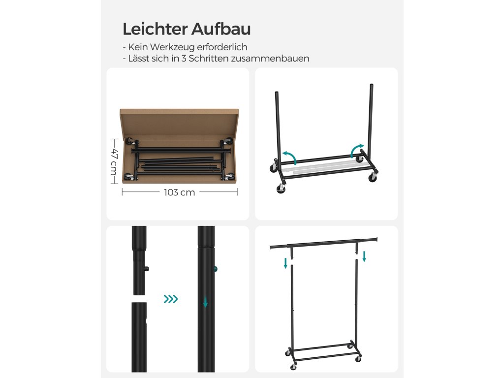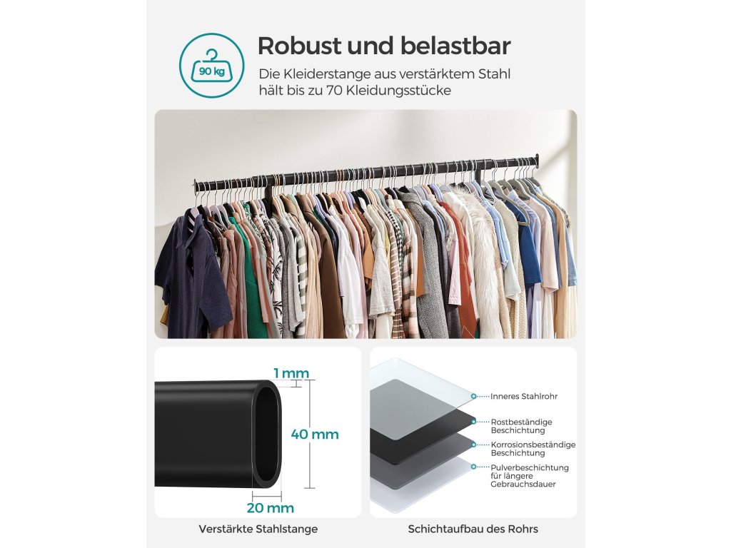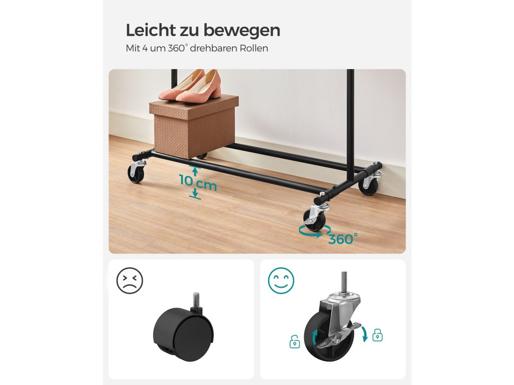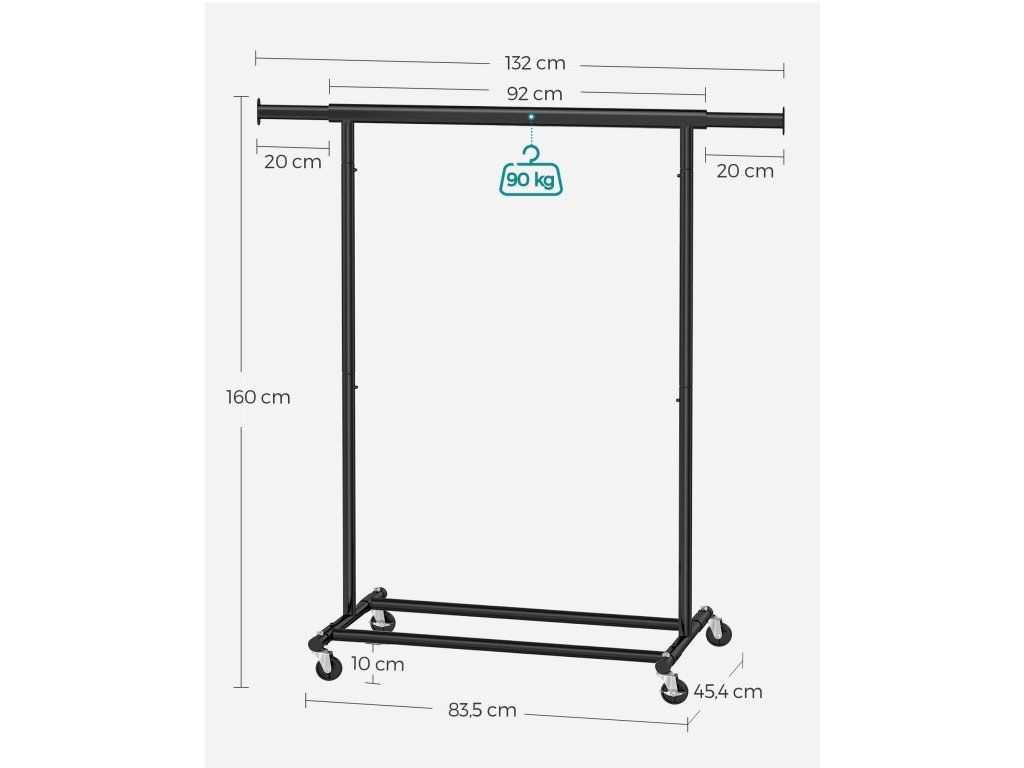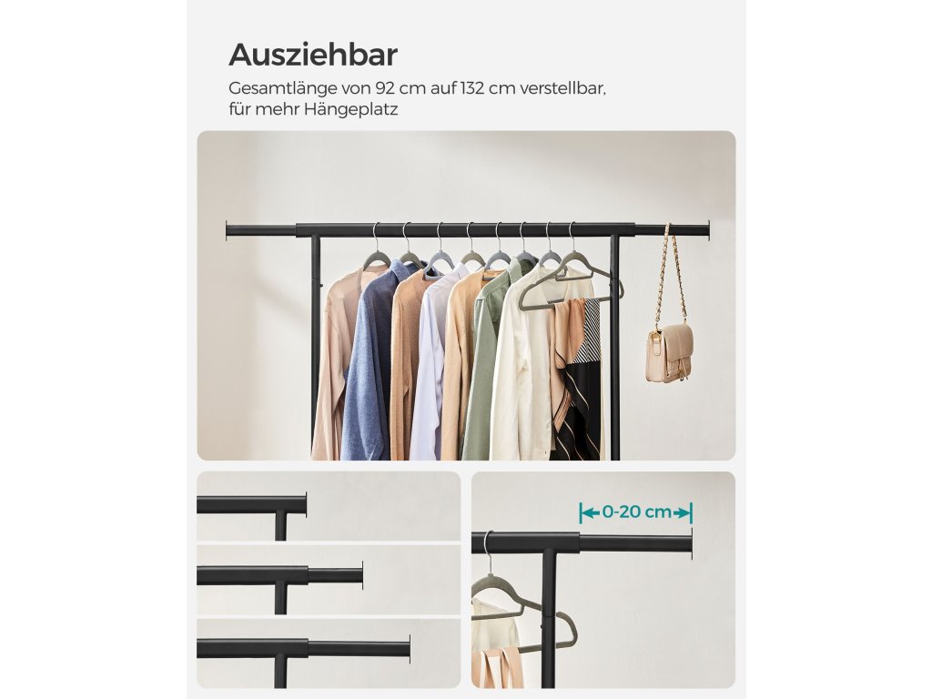 Zvýšená nosnost: Díky ocelovým trubkám o tloušťce 1 mm, které jsou silnější a pevnější než běžné trubky o tloušťce 0,8 mm, a odolným PP kolečkům unese tento věšák na oblečení až 90 kg. Neváhejte si proto pověsit těžké kabáty!.Výsuvná závěsná lišta: Každý konec horní lišty se prodlouží o dalších 20 cm, abyste měli více prostoru pro zavěšení (horní lišta se prodlouží z 92 cm na 132 cm); 2 prodlužovací konce jsou také ideální pro zavěšení kabelek, klobouků, šátků nebo jiných doplňků;Snadné přemisťování a zamykání: Tento věšák na oděvy je vybaven 4 kolečky otočnými o 360°, z nichž 2 jsou uzamykatelná, takže jej můžete snadno přemístit z ložnice do šatny a v případě potřeby jej uzamknout.Snadná montáž a skladování: K sestavení této oděvní lišty není potřeba žádné nářadí a lze ji připravit v pouhých 3 krocích! Když se nepoužívá můžete ji rychle rozložit a uložit pod postel nebo do nepoužívaného rohu, abyste ušetřili místo.Všestranné použití: Tento věšák na oděvy je dodáván se 2 spodními tyčemi pro úložné boxy, takže je funkční jak v ložnici či šatně k ukládání věcí denní potřeby, tak v prádelně k sušení oděvů. Práškově lakovaná ocel umožňuje i venkovní použití.| Kategorie: | Stojany na oblečení |
