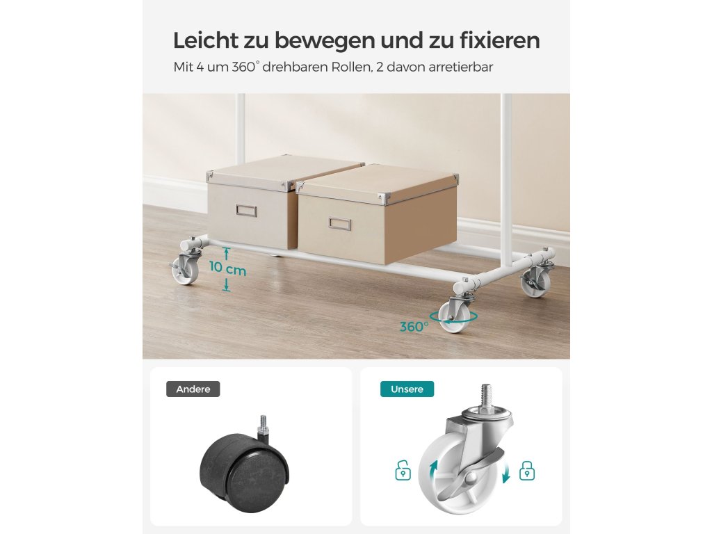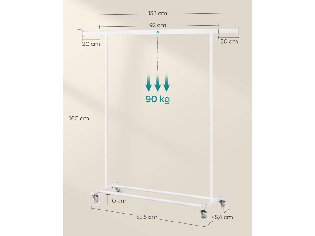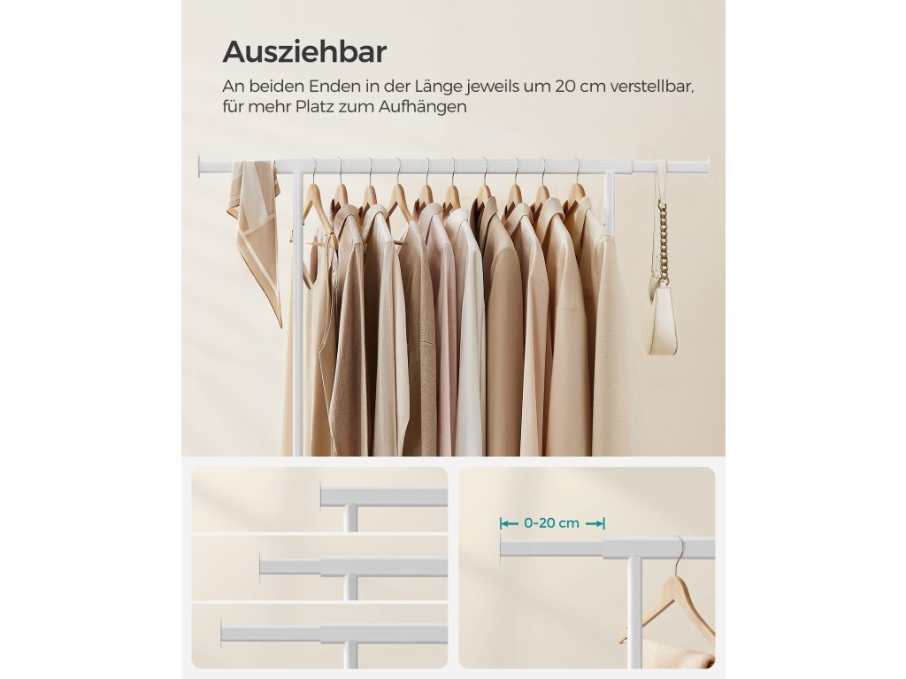 Zvýšená nosnost Díky ocelovým trubkám o tloušťce 1 mm, které jsou silnější a pevnější než běžné trubky o tloušťce 0,8 mm, a odolným PP kolečkům unese tento stojan na oblečení až 90 kg. Neváhejte si proto pověsit těžké kabáty!.Výsuvná závěsná lišta Každý konec horní lišty se prodlouží o dalších 20 cm, abyste měli více prostoru pro zavěšení (horní lišta se prodlouží z 92 cm na 132 cm); 2 prodlužovací konce jsou také ideální pro zavěšení kabelek, klobouků, šátků nebo jiných doplňků;Snadný přesun a aretace Tento věšák na oblečení je vybaven 4 kolečky otočnými o 360°, z nichž 2 jsou uzamykatelná, takže jej můžete snadno přesunout z ložnice do šatny a v případě potřeby jej uzamknout.Snadná montáž a skladování K sestavení této oděvní lišty není potřeba žádné nářadí a lze ji připravit v pouhých 3 krocích! Když se nepoužívá můžete ji rychle rozložit a uložit pod postel nebo do nepoužívaného rohu, abyste ušetřili místo.Všestranné použití Tento věšák na oděvy je dodáván se 2 spodními tyčemi pro úložné boxy, takže je funkční jak v ložnici nebo šatně pro ukládání věcí denní potřeby, tak v prádelně pro sušení oděvů. Práškově lakovaná ocel umožňuje i venkovní použití.| Kategorie: | Stojany na oblečení |
