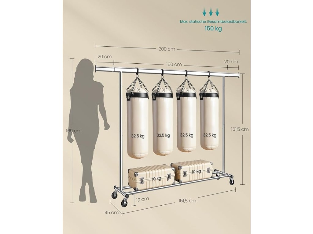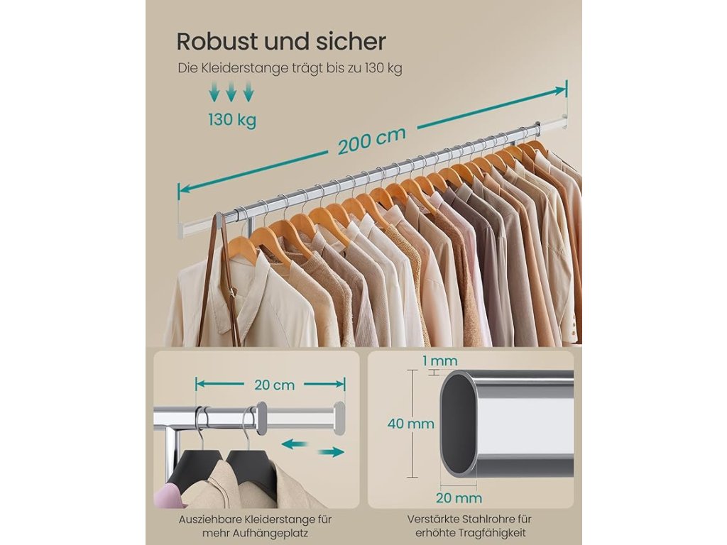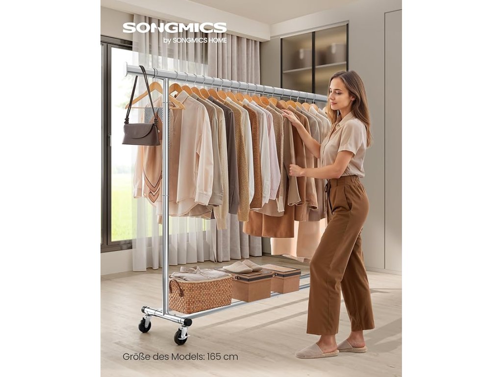 Zvýšená nosnost: ocelové trubky s tloušťkou stěny 1 mm, které jsou robustnější než trubky s tloušťkou stěny 0,8 mm, vysokopevnostní průmyslová kolečka z PP - tento stojan na oblečení unese až 150 kg. Kabáty a bundy můžete stabilně zavěsit.Výsuvná tyč na oblečení: tyč na oblečení je na obou koncích nastavitelná na délku 20 cm (délka tyče na oblečení: 160-200 cm), což poskytuje více prostoru pro zavěšení; tašky, klobouky, šály a další příslušenství se vejdou na boční tyče;Snadný pohyb a aretace: tento stojan na kabáty je vybaven 4 kolečky otočnými o 360°. 2 z nich s brzdami, takže je můžete snadno přesunout z ložnice do šatny a udržet je na jednom místě podle potřeby.Snadná montáž, snadné skladování: není třeba žádné nářadí - věšák na oblečení lze sestavit v pouhých 3 krocích; když ji nepoužíváte, můžete ji rychle rozložit a uložit pod postel nebo do rohu, abyste ušetřili místo;Všestrannost: stojan má nejen tyč na oděvy, ale také 2 spodní tyče pro umístění košů. Hodí se do ložnice na každodenní nošení, do prádelny na praní prádla nebo ven díky chromovanému kovu odolnému proti korozi.| Kategorie: | Stojany na oblečení |