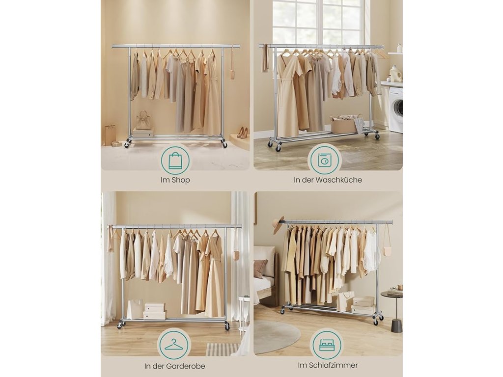 Věšák na oděvy na kolečkách, rozšiřitelná kolejnice na oděvy, nosnost 150 kg, snadná montáž, stříbrná.