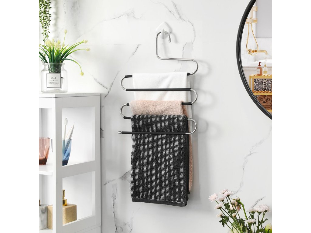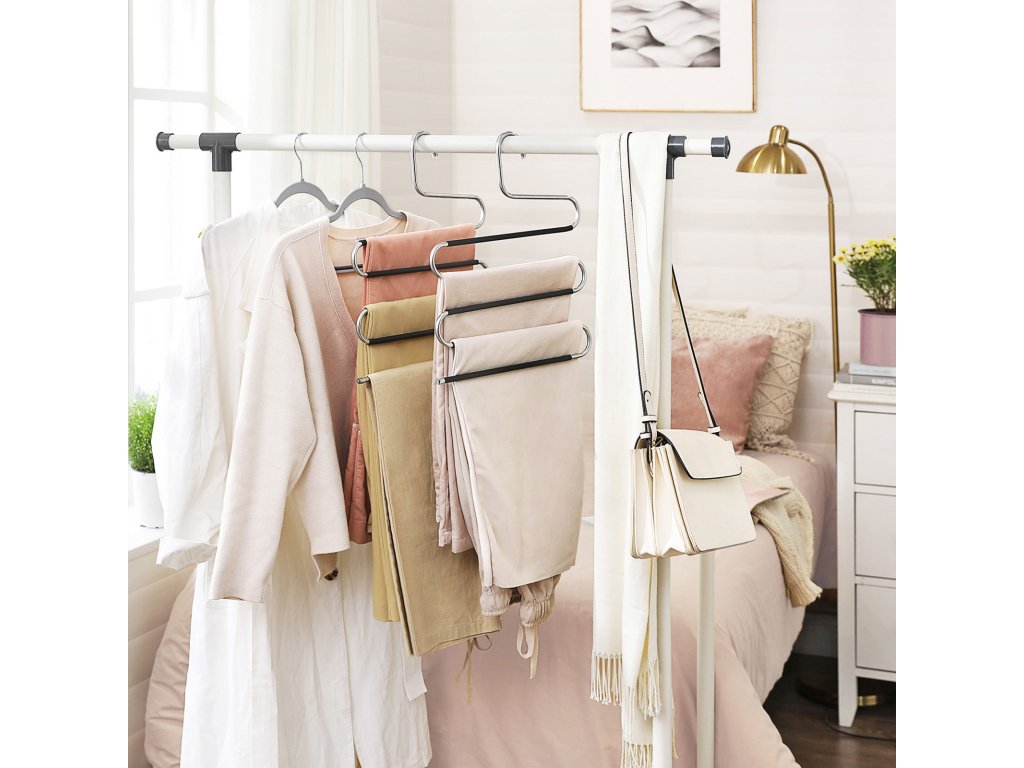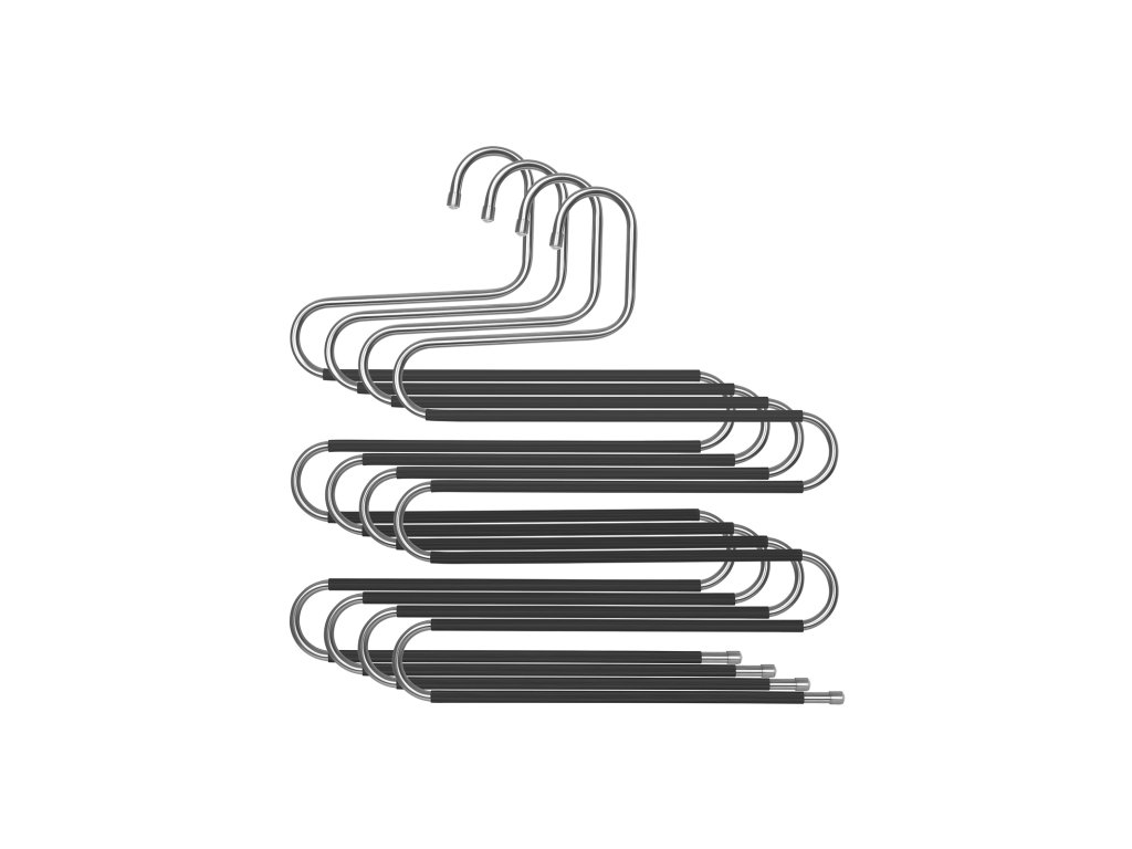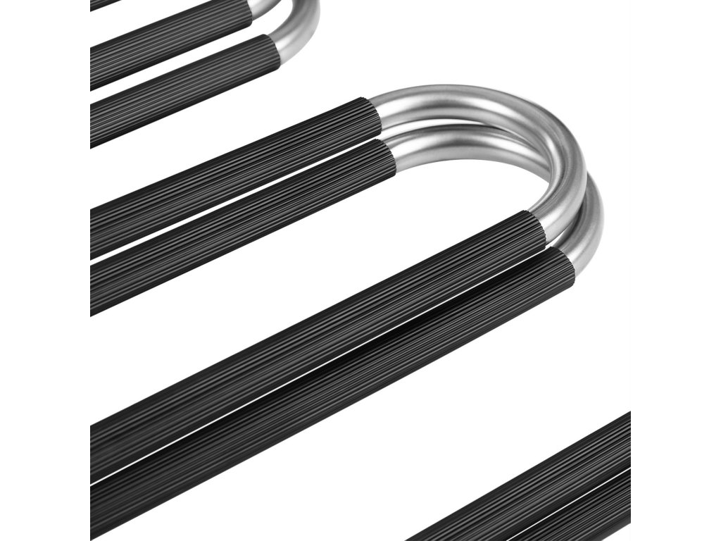 Věšáky na kalhoty, balení 4 prostorově úsporných pětiúrovňových kovových věšáků na kalhoty, protiskluzové věšáky typu S na džíny, šátky, ručníky, kravaty, stříbrná a černá.