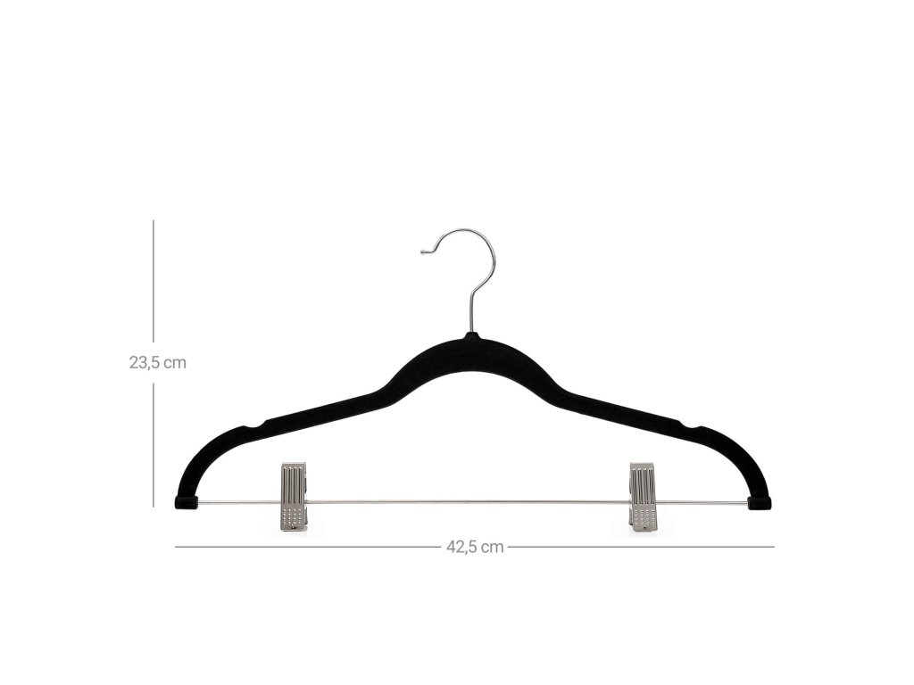 Věšáky na kalhoty, sada 12 sametových věšáků s nastavitelnými klipy, délka 42,5 cm, protiskluzové, šetří místo, na sukně, kabáty, šaty, černé.