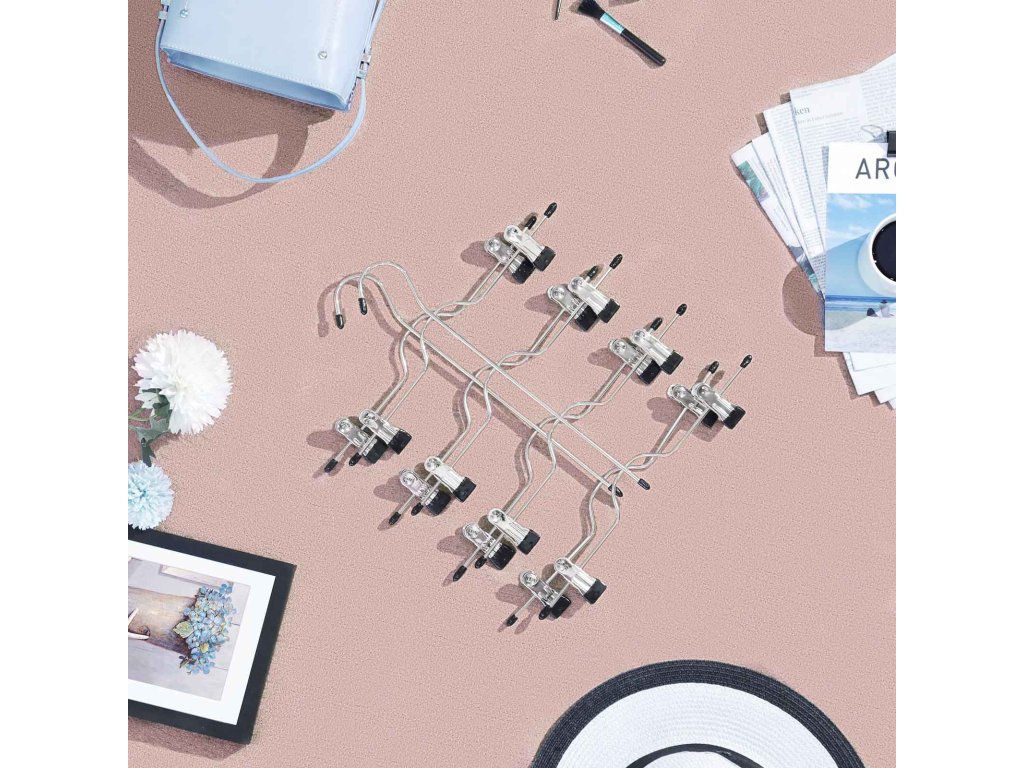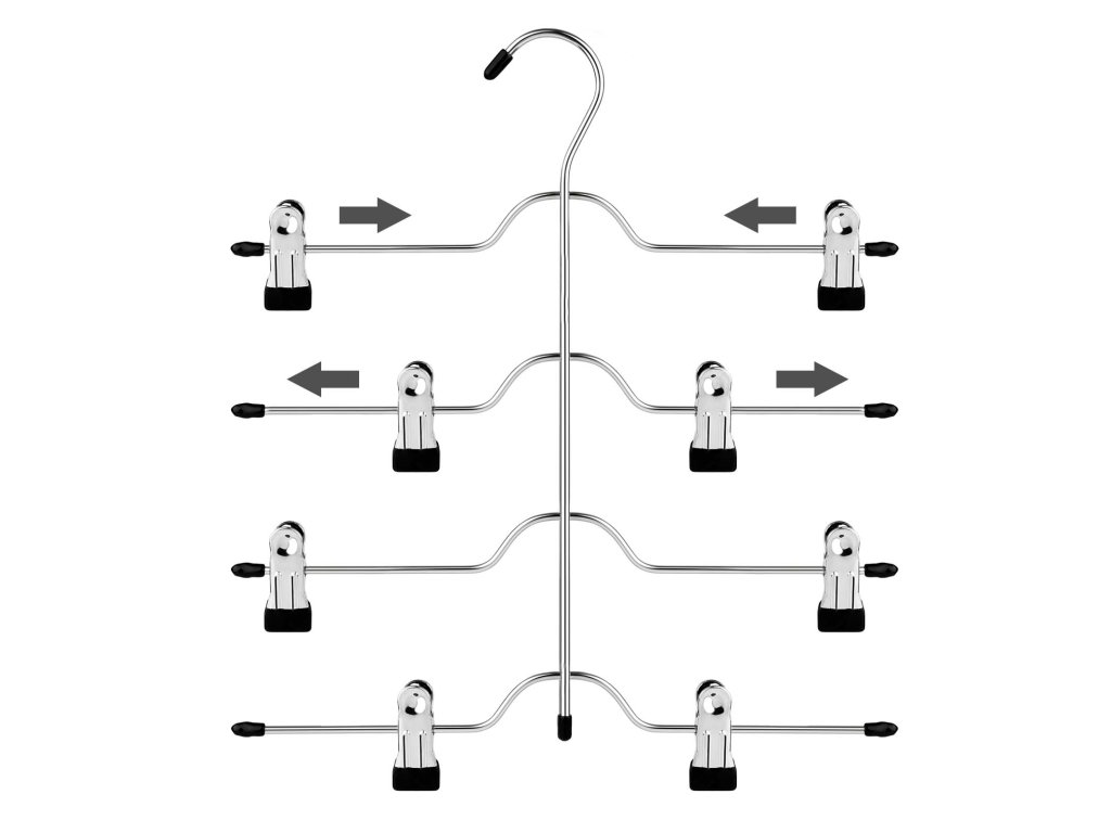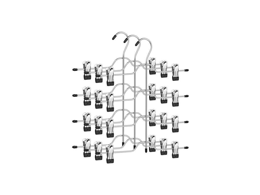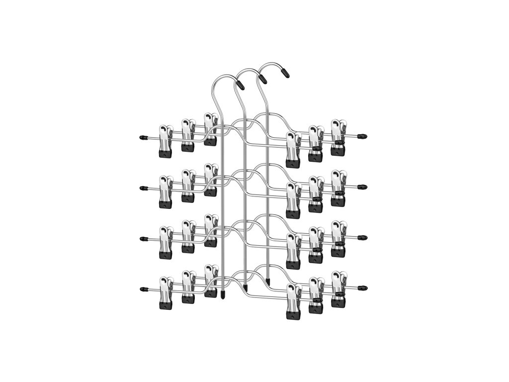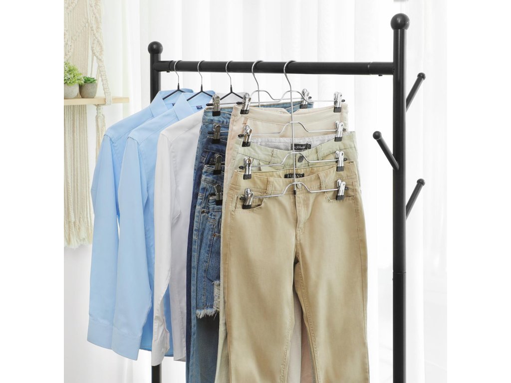1 ROVNÁ SE 4: Pokud nemáte skříň, kterou si žena opravdu zaslouží. Nepodléhejte ještě vesmírnému blues! Náš věšák na kalhoty pojme až 4 páry kalhot a přitom nezabere více místa než jeden běžný věšák, takže vaše skříň bude vypadat uklizeněji a ano, větší!UŽ ŽÁDNÉ ODKLÁDÁNÍ: Nebaví vás, že vám oblečení neustále padá na zem? Tato ramínka na oblečení s klipovými hroty potaženými PVC udrží vaše kalhoty, džíny, ponožky uspořádané a nepomačkané. můžete si v klidu vybrat denní oblečení.PRO DOSPĚLÉ I PRO DĚTI: Klipsy jsou nastavitelné pro různé velikosti a styly a jejich polstrované konce zajišťují bezpečné používání. takže s touto sadou 3 ramínek na sukně můžete naučit věšet oblečení i své děti!Dotek lesku: Nikdo se nechce každé ráno prodírat nepřehlednými zásuvkami, aby našel tu správnou sukni; tento čtyřpatrový kovový věšák na kalhoty ve stříbrném chromovém provedení elegantně vystaví vaše oblečení a zároveň dodá vašemu šatníku styl;| Kategorie: | Šatní ramínka |
