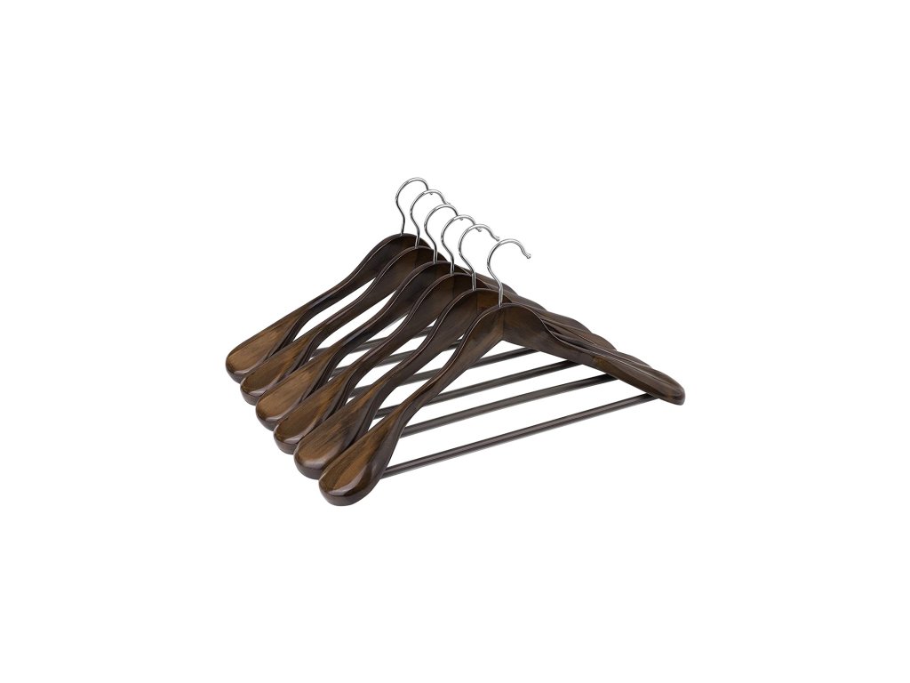 Věšáky na obleky, masivní dřevěné věšáky s širokými konci, protiskluzová tyč na kalhoty, sada 6 kusů na oblečení, košile, kabáty, saka, kalhoty, kalhoty, 360° otočný hák, tmavý ořech.