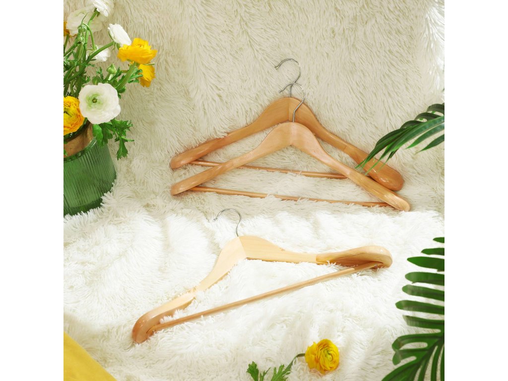 Věšáky na obleky, sada 6 kusů, tvarované věšáky z masivního dřeva s extra širokými rameny, protiskluzové, na oblečení, košile, kabáty, saka, kalhoty, kalhoty, 360° otočný háček, přírodní barva.
