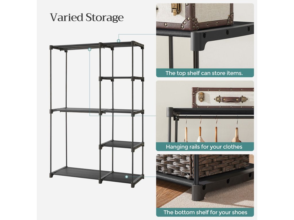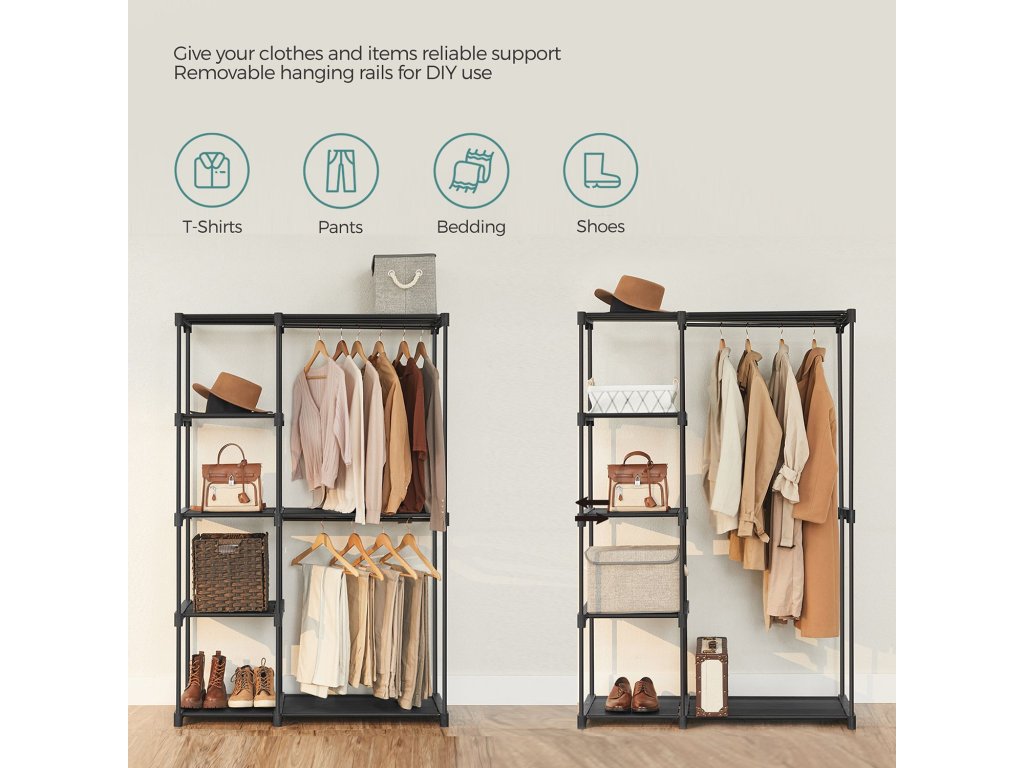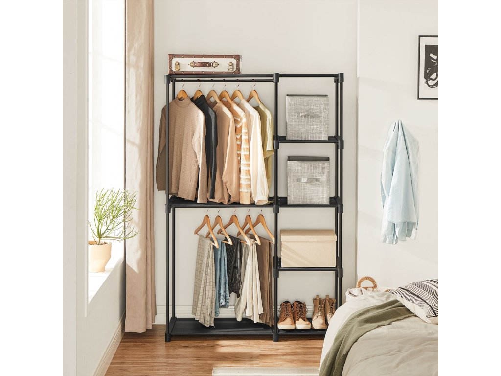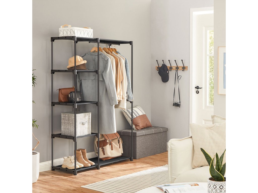 Volně stojící šatní skříň, skládací skříň, věšák s kolejnicemi na oblečení, věšák na oblečení, otevřená úložná skříň, úložný organizér, šatna, ložnice, pracovna 112 x 43 x 165 cm, černá.