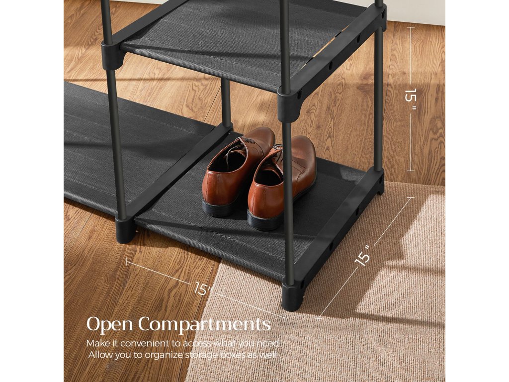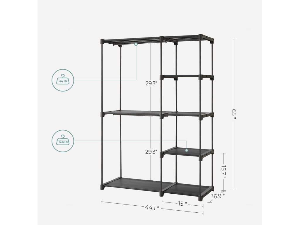 Dostatek úložného prostoru: Šatní skříň o rozměrech 112 x 43 x 165 cm nabízí prostorný úložný prostor pro zavěšení oblečení a několik polic na složené oblečení a další doplňky.Mějte své oblečení na očích: Tento věšák nabízí otevřený úložný prostor pro vaše oblečení. Takže když si potřebujete vybrat oblečení na velký den, máte vše na dosah ruky.Stabilita je na prvním místě: Každá vrstva má 4 silné kovové trubky o průměru 16 mm a aktualizované plastové konektory, takže každá vrstva unese až 8 kg. Každá závěsná tyč je také dostatečně robustní pro zatížení až 20 kg.3 možnosti ukládání: Díky různým úložným částem - závěsným tyčím, dlouhým policím a krátkým regálům - tato skříň vyhoví vašim různým potřebám. Nemusíte tedy omezovat své oblečení, abyste ho měli v pořádku.Snadná montáž: Montáž této šatní skříně je rychlá a snadná, protože nevyžaduje žádné nářadí a všechny plastové konektory jsou stejné. Jediné, co musíte udělat, je připojit kovové trubky ke konektorům.| Kategorie: | Šatní skříně |