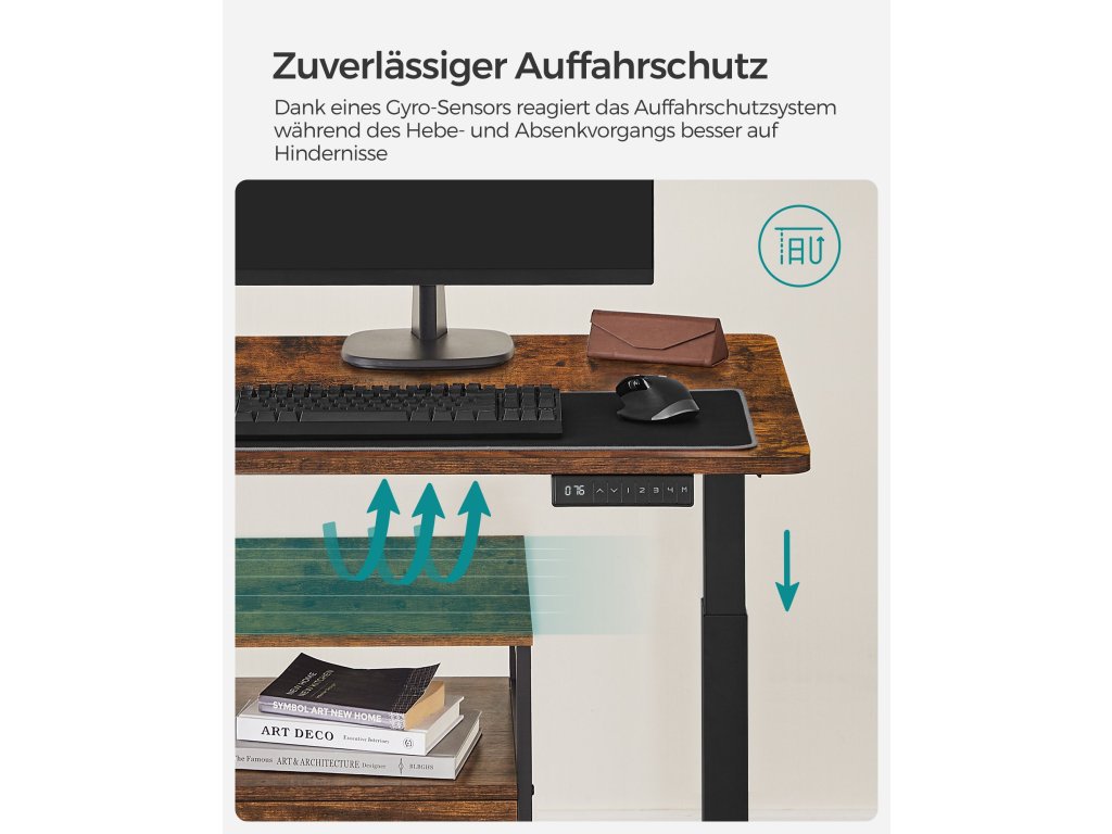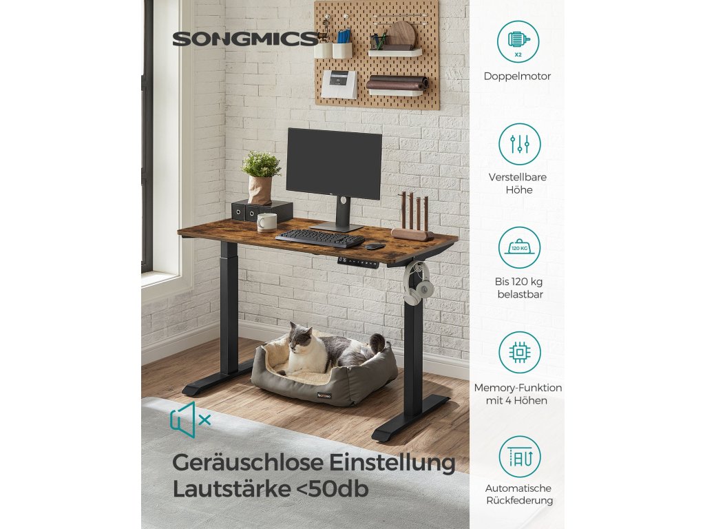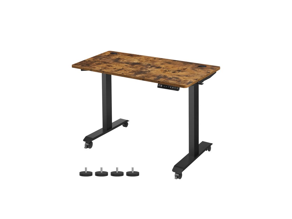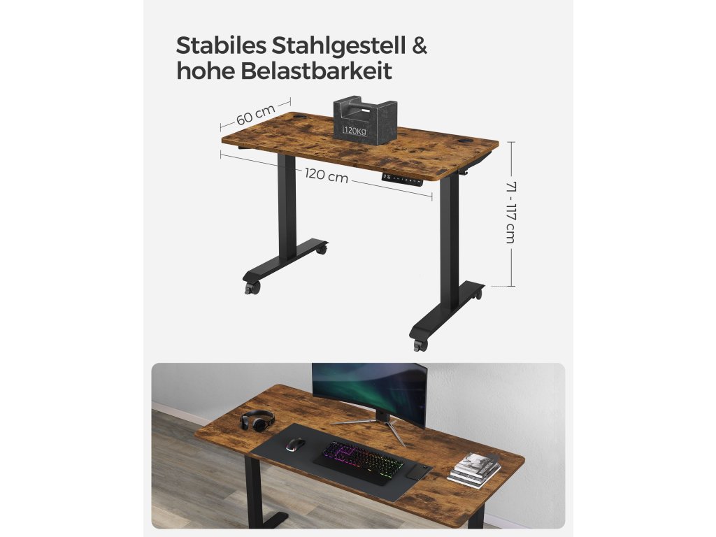 Výškově nastavitelný Tento stůl je výškově nastavitelný v rozmezí 71 až 117 cm, rychlost nastavení je 32 mm/s (tichý chod). Vsedě nebo vestoje? Najděte si ideální polohu, která zvýší vaši pracovní efektivitu.Stabilní a flexibilní: díky dvojitým opěrným tyčím a dvojitému motoru je stůl stabilní, až do 120 kg a plynule se rozjíždí a zastavuje. nastavitelné nožičky vyrovnávají nerovnosti a lze je nahradit 4 kolečky pro snadnou přepravu.Paměť a bezpečnostní funkce Pomocí tlačítek si můžete uložit 4 výšky pro rychlé nastavení; z bezpečnostních důvodů se výškové nastavení zastaví a mírně zasune rám stolu, když při jízdě narazí na pevnou překážku;Vysoce kvalitní deska stolu Povrch stolu o rozměrech 60 x 120 cm je vyroben z odolné dřevotřísky a je trvanlivý a snadno se čistí; zkosené hrany zabraňují poškrábání.Rám stolu s nastavitelnou šířkou Elektrický stolní stojan je nastavitelný na šířku v rozmezí 107,5 až 175 cm, což umožňuje flexibilní přizpůsobení různým deskám stolu (hloubka: 60-80 cm, šířka: 120-200 cm).