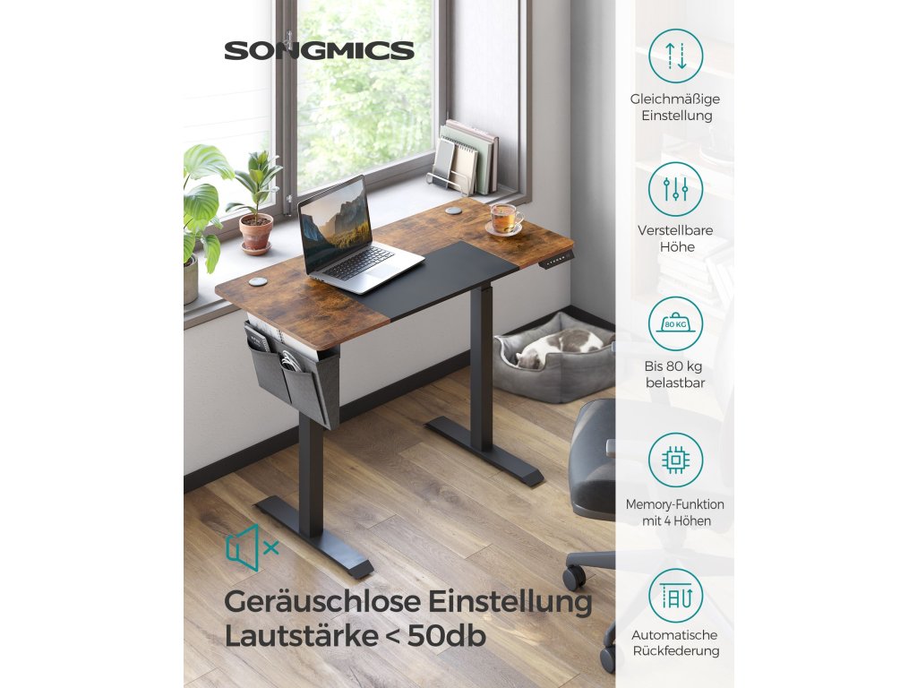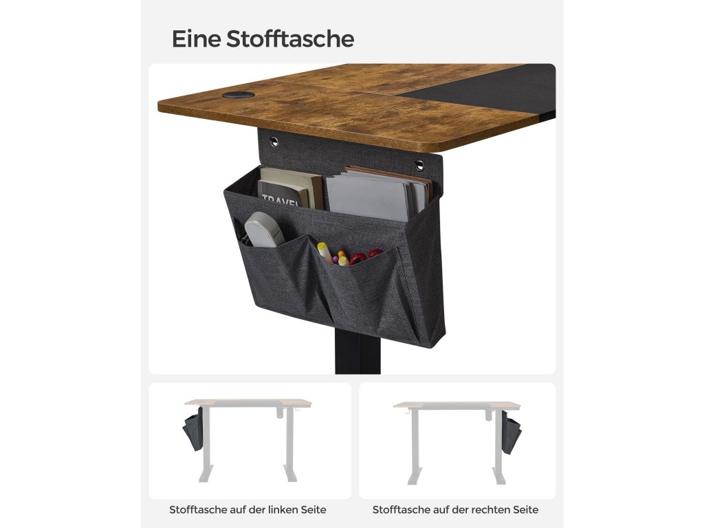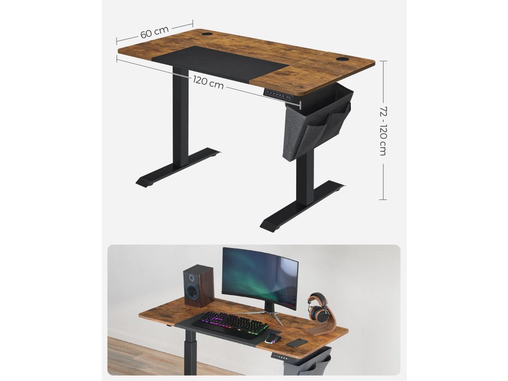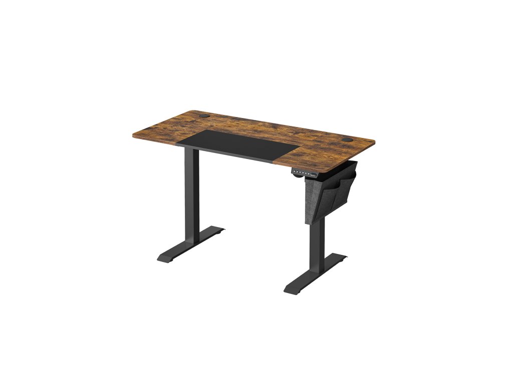 4 paměťová tlačítka a ochrana proti zatížení Výšku elektrického stolu můžete nastavit v rozmezí 72 až 120 cm a uložit 4 preferované výšky. K dispozici je také systém ochrany proti zatíženíKapsa a háček na stranách Látková kapsa na levé nebo pravé straně na knihy, časopisy a psací potřeby a 2 háčky na druhé straně na sluchátka a kapsy. Nic neprospívá vašemu soustředění více než uklizený pracovní stůl!.Atraktivní vzhled s mnoha detaily Splétaná deska ve vintage hnědé a černé barvě dodává tomuto stolnímu stojanu více stylu a textura připomínající látku v černé části desky stolu působí příjemně.Bezproblémová montáž Označené díly a přehledné ilustrované pokyny zaručují snadnou montáž. Flexibilní styl práce si tak můžete najít během chvilky.Stabilní a tichý Tento elektrický stůl s robustním ocelovým rámem unese až 80 kg, tichá stolní deska s provozní hlučností nižší než 50 dB.| Kategorie: | Psací a pracovní stoly |