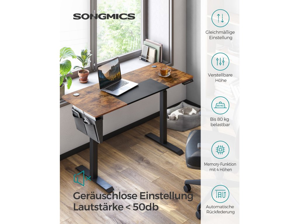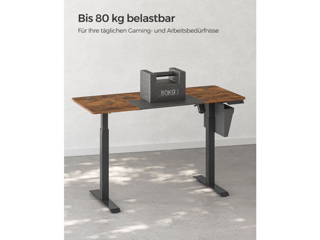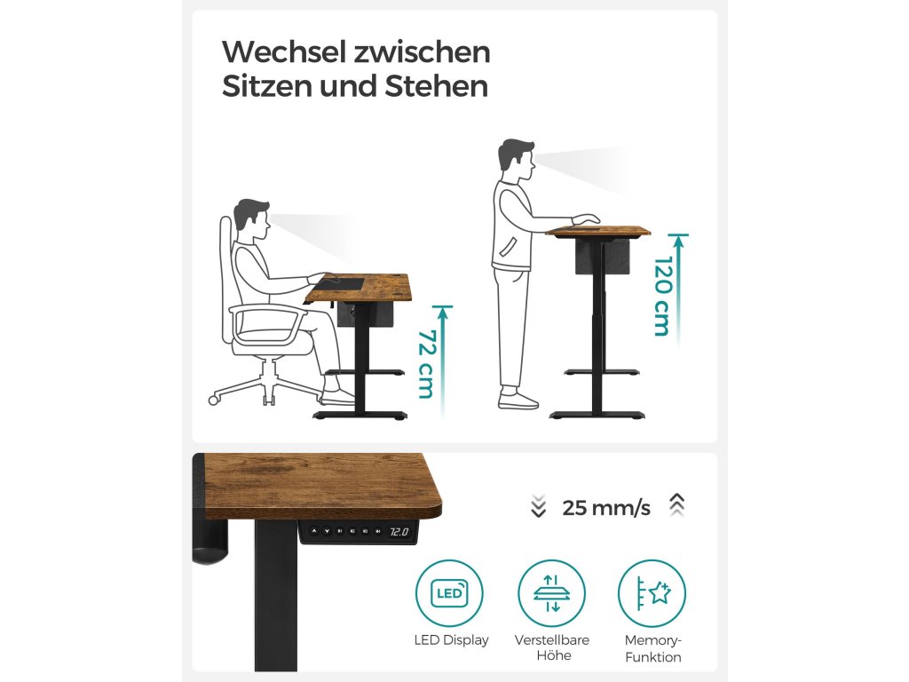 4 paměťová tlačítka a ochrana proti zatížení Výšku elektrického stolu můžete nastavit v rozmezí 72 až 120 cm a uložit 4 preferované výšky. K dispozici je také systém ochrany proti zatíženíKapsa a háček na stranách Látková kapsa na levé nebo pravé straně na knihy, časopisy a psací potřeby a 2 háčky na druhé straně na sluchátka a kapsy. Nic neprospívá vašemu soustředění více než uklizený pracovní stůl!.Atraktivní vzhled s mnoha detaily Splétaná deska ve vintage hnědé a černé barvě dodává tomuto stolnímu stojanu více stylu a textura připomínající látku v šedé oblasti desky stolu působí příjemně.Bezproblémová montáž Označené díly a přehledné ilustrované pokyny zaručují snadnou montáž. Flexibilní styl práce si tak můžete najít během chvilky.Stabilní a tichý Tento elektrický stůl s robustním ocelovým rámem unese až 80 kg, tichá stolní deska s provozní hlučností nižší než 50 dB.| Kategorie: | Psací a pracovní stoly |