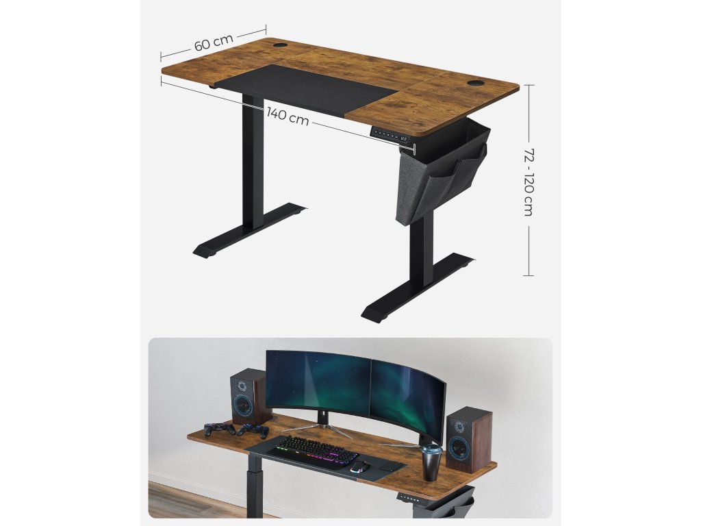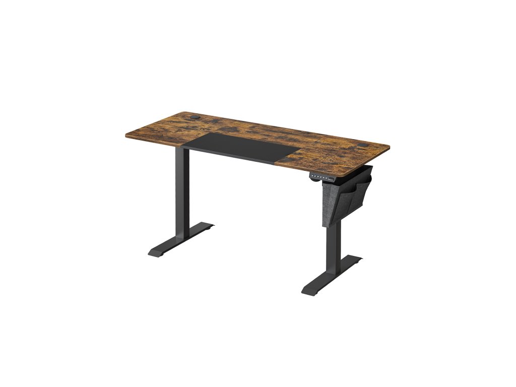Výškově nastavitelný elektrický stůl, 60 x 140 x (72-120) cm, plně nastavitelný, spojovaná deska, paměťová funkce se 4 výškami, ochrana proti zatížení, vintage hnědo-černý.
