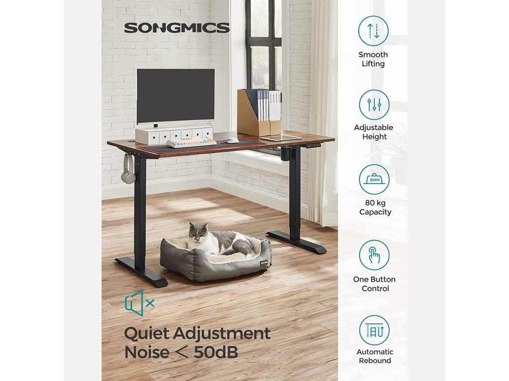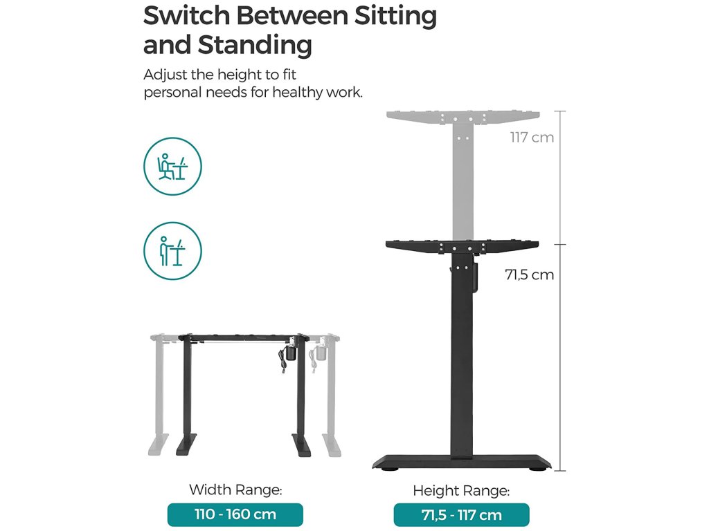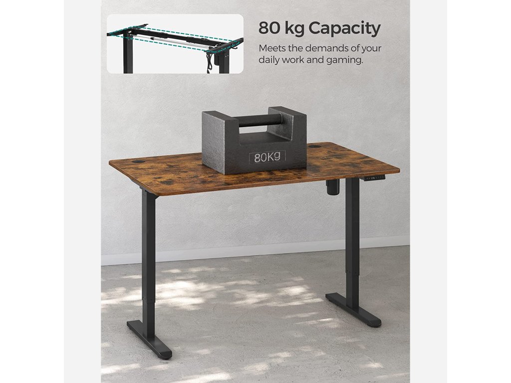 VÝŠKOVĚ NASTAVITELNÝ: Tento rám stolu je výškově nastavitelný (73-118 cm), vhodný pro osoby s výškou 1,1-1,95 m. vsedě nebo vestoje? Najděte ideální polohu, která uleví vašemu tělu a umožní efektivní učení nebo práci.Stabilní a flexibilní: díky ocelové konstrukci je tento stolní stojan stabilní a unese až 80 kg; nastavitelné nožičky vyrovnávají nerovnosti a chrání podlahu před poškrábáním, lze je také nahradit kolečky pro snadnou přepravu;Praktický design: díky tlačítkům ušetříte 3 výšky; s portem USB a TYPE-C můžete nabíjet svá zařízení; z bezpečnostních důvodů se nastavení výšky zastaví a stůl se mírně zasune, když při jízdě narazí na překážku;Žádný hluk: vysoce kvalitní motor zaručuje tiché a jemné nastavení výšky, rychlost nastavení je 25 mm/s, hladina hluku je nízká (< 50 dB), takže můžete nerušeně pokračovat v práci nebo učení.Nastavitelný rám stolu: tento robustní ocelový rám stolu je nastavitelný na délku v rozmezí 86-135 cm, a proto se hodí pro různé stolové desky (délka 110-160 cm, šířka 60-80 cm).| Kategorie: | Psací a pracovní stoly |