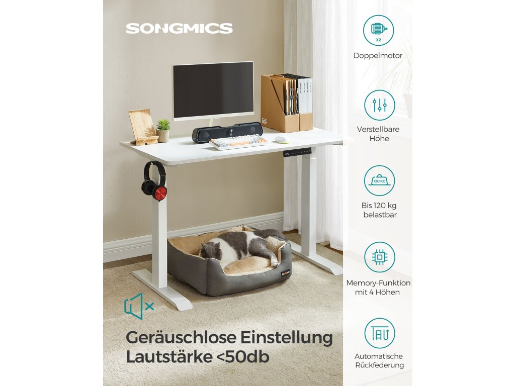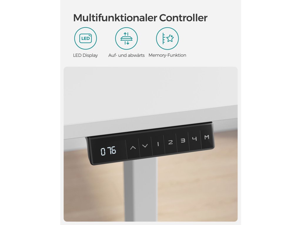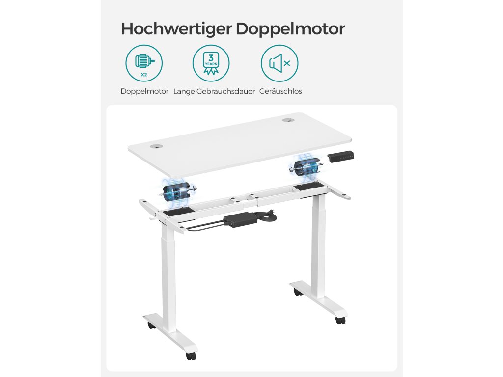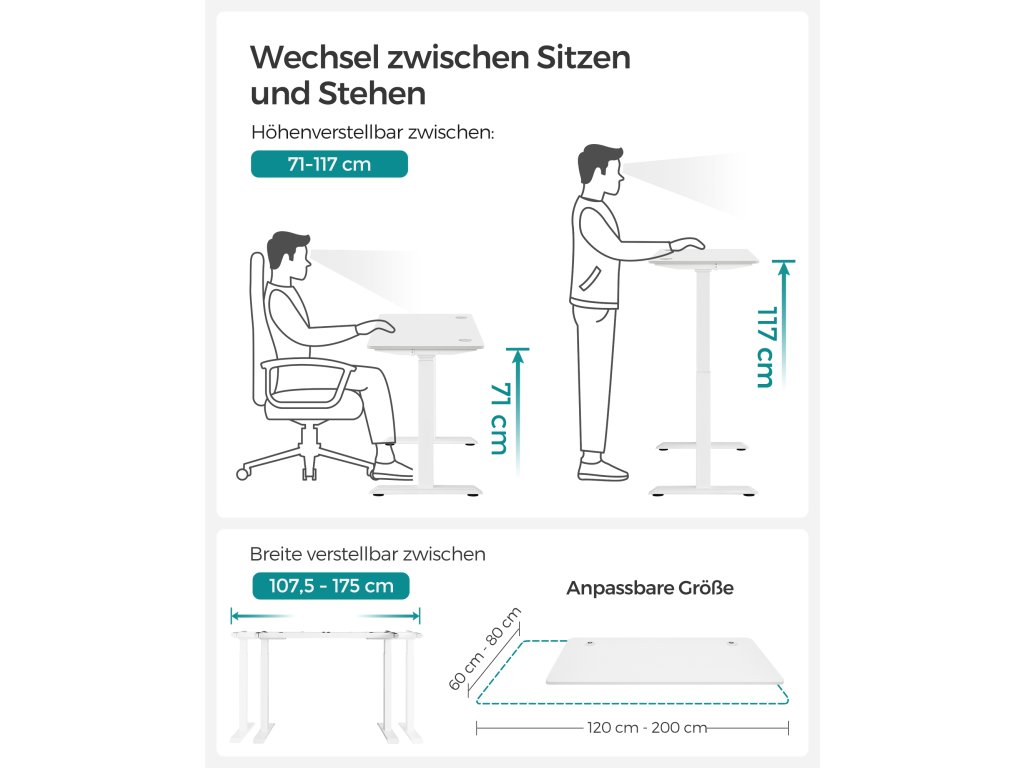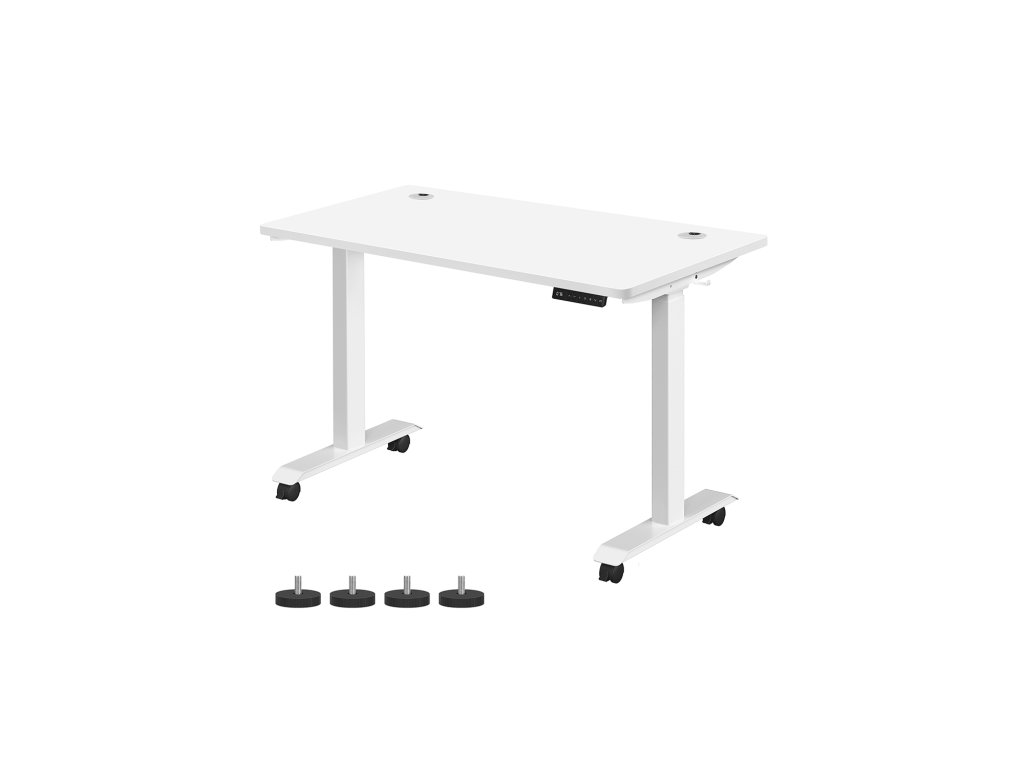 Výškově nastavitelný Tento stůl je výškově nastavitelný v rozmezí 71 až 117 cm, rychlost nastavení je 32 mm/s (tichý chod). Vsedě nebo vestoje? Najděte si ideální polohu, která zvýší vaši pracovní efektivitu.Stabilní a flexibilní: díky dvojitým opěrným tyčím a dvojitému motoru je stůl stabilní, až do 120 kg a plynule se rozjíždí a zastavuje. nastavitelné nožičky vyrovnávají nerovnosti a lze je nahradit 4 kolečky pro snadnou přepravu.Paměť a bezpečnostní funkce Pomocí tlačítek si můžete uložit 4 výšky pro rychlé nastavení; z bezpečnostních důvodů se výškové nastavení zastaví a mírně zasune rám stolu, když při jízdě narazí na pevnou překážku;Vysoce kvalitní deska stolu Povrch stolu o rozměrech 60 x 120 cm je vyroben z odolné dřevotřísky a je trvanlivý a snadno se čistí; zkosené hrany zabraňují poškrábání.Rám stolu s nastavitelnou šířkou Elektrický stolní stojan je nastavitelný na šířku v rozmezí 107,5 až 175 cm, což umožňuje flexibilní přizpůsobení různým deskám stolu (hloubka: 60-80 cm, šířka: 120-200 cm).| Kategorie: | Psací a pracovní stoly |