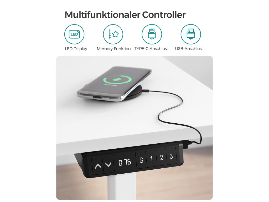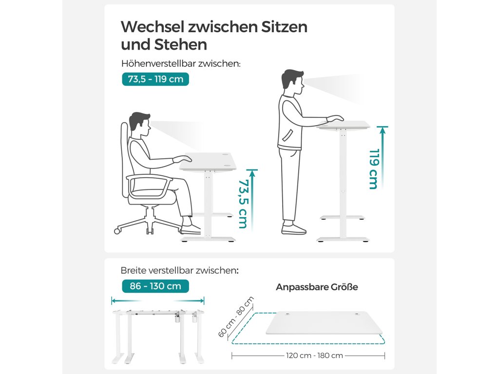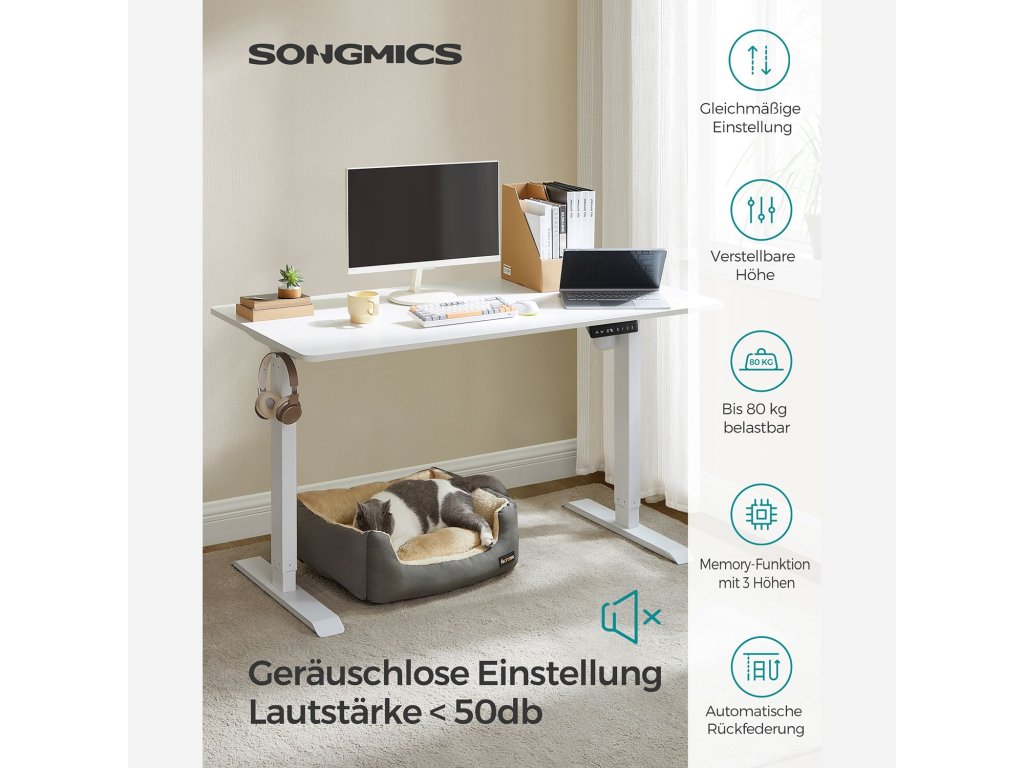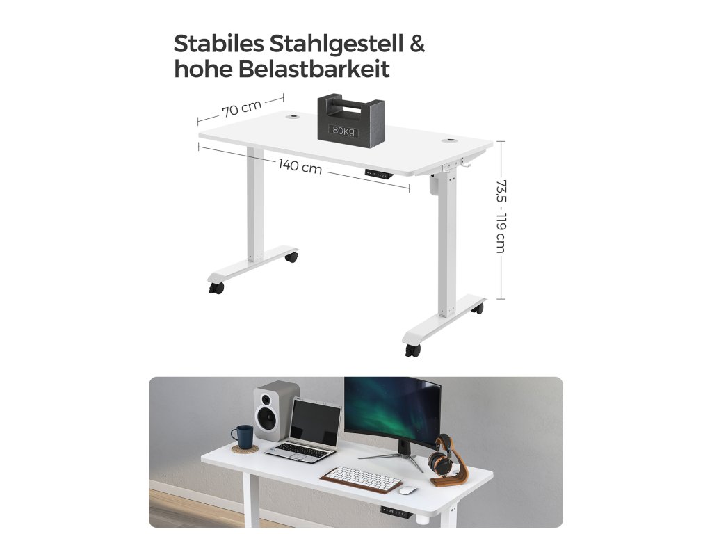 Nastavitelná výška Tento stůl je výškově nastavitelný v rozmezí 73,5 až 119 cm, rychlost nastavení je 25 mm/s (tichý chod). Vsedě nebo vestoje? Najděte si ideální polohu, která zvýší vaši pracovní efektivitu.Dobrá stabilita Robustní ocelový rám a nastavitelné nohy, které lze nahradit 4 kolečky, dodávají tomuto stolnímu stojanu vysokou stabilitu a nosnost 80 kg; také se hladce rozjíždí a zastavuje.Vysoce kvalitní deska stolu Povrch stolu o rozměrech 70 x 140 cm je vyroben z odolné dřevotřísky a je trvanlivý a snadno se čistí; zkosené hrany zabraňují poškrábání.Pohodlné a bezpečné Úložiště 3 různých výšek pro rychlé nastavení; s portem USB a TYPE-C můžete nabíjet svá zařízení; k dispozici je také systém ochrany proti zatížení.nastavitelný rám stolu] Elektrický stolní stojan je nastavitelný na šířku mezi 86 a 130 cm, což umožňuje flexibilní přizpůsobení různým deskám stolu (hloubka: 60-80 cm, šířka: 110-160 cm).| Kategorie: | Psací a pracovní stoly |