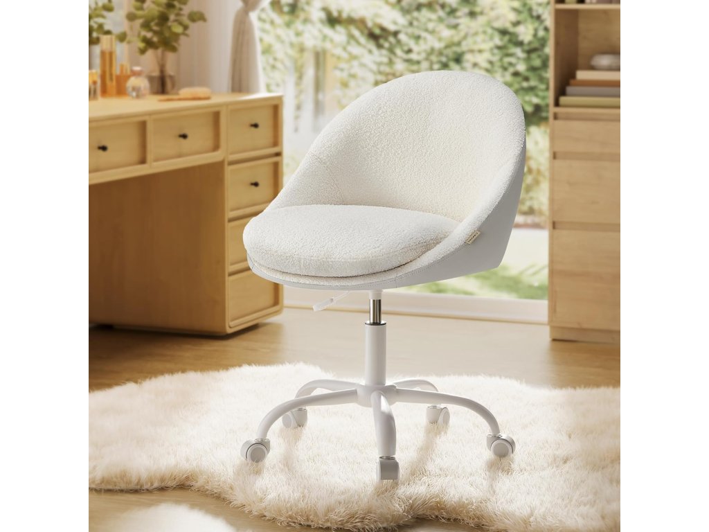 Stylové a univerzální Díky elegantnímu vzhledu a jednoduchým geometrickým liniím dodá tato otočná židle vašemu pokoji jedinečný šarm. Můžete ji používat k práci, studiu nebo líčení.Úspora místa Tato kompaktní kancelářská židle otočná o 360° (60 x 60 cm) je výškově nastavitelná o 10 cm a nemá područky. Pokud židli nepoužíváte, můžete ji zasunout pod stůl a ušetřit tak místo.Vysoký komfort sezení Dvojitý dobře polstrovaný polštář (horní 7 cm silný), zakřivený tvar velké sedací plochy zmírňuje tlak na boky; potah z tkaniny sherpa je prodyšný. Vše nabízí vysoký komfort sezení;Snadná instalace Připevněte základní desku ke spodní části sedadla pomocí šroubů, nainstalujte plynové lahve a kolečka - stačí jen pár kroků a počítačová židle je hotová.Spolehlivý úchop: unese až 110 kg| Kategorie: | Kancelářské židle |