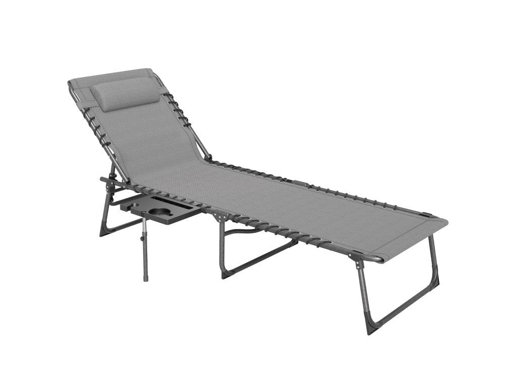 Více pohodlí: Mějte své nezbytnosti snadno po ruce díky odkládacímu stolku a boční kapse připevněné ke skládacímu lehátku. Ideální pro uložení nápojů, telefonů, knih a dalších věcí při opalování.