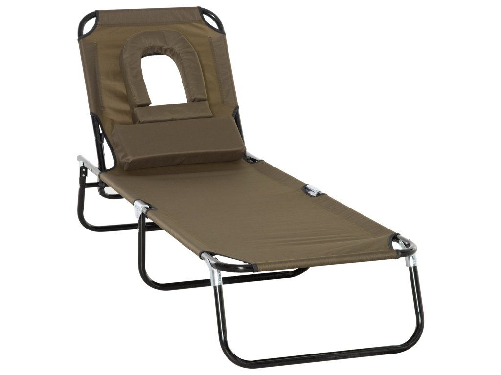 POHODLÍ: Kempingová postýlka má polstrovanou opěrku hlavy a 4pozičně nastavitelné opěradlo a také unikátní čtecí otvor. Jednoduše položte knihu na zem, aniž byste ji museli držet.