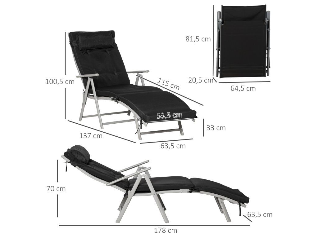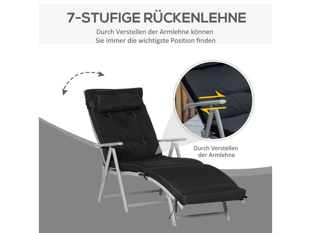 Udělejte si pohodlí na tomto vynikajícím plážovém lehátku! Toto zahradní lehátko má robustní kovový rám s práškovým nástřikem a unese až 165 kg. Opěradlo se dá sklopit do sedmi různých poloh, což vám umožní rychle najít perfektní polohu k sezení nebo ležení. Prodyšný potah sedáku z textilní tkaniny a přiložený polštář poskytují větší pohodlí. Lehátko se snadno skládá pro úsporu místa při skladování.