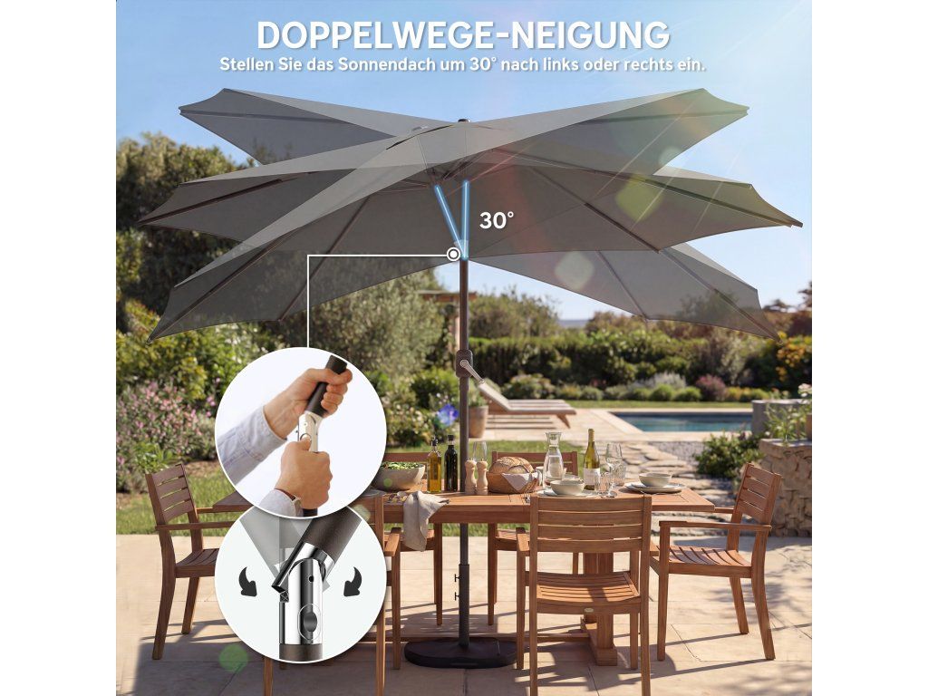 Nastavitelný oboustranný úhel sklonu: Všestranný zahradní deštník umožňuje naklonění o 30° doleva a doprava, poskytuje celodenní stín a přizpůsobuje se úhlu slunce, aby bylo zajištěno optimální pohodlí.