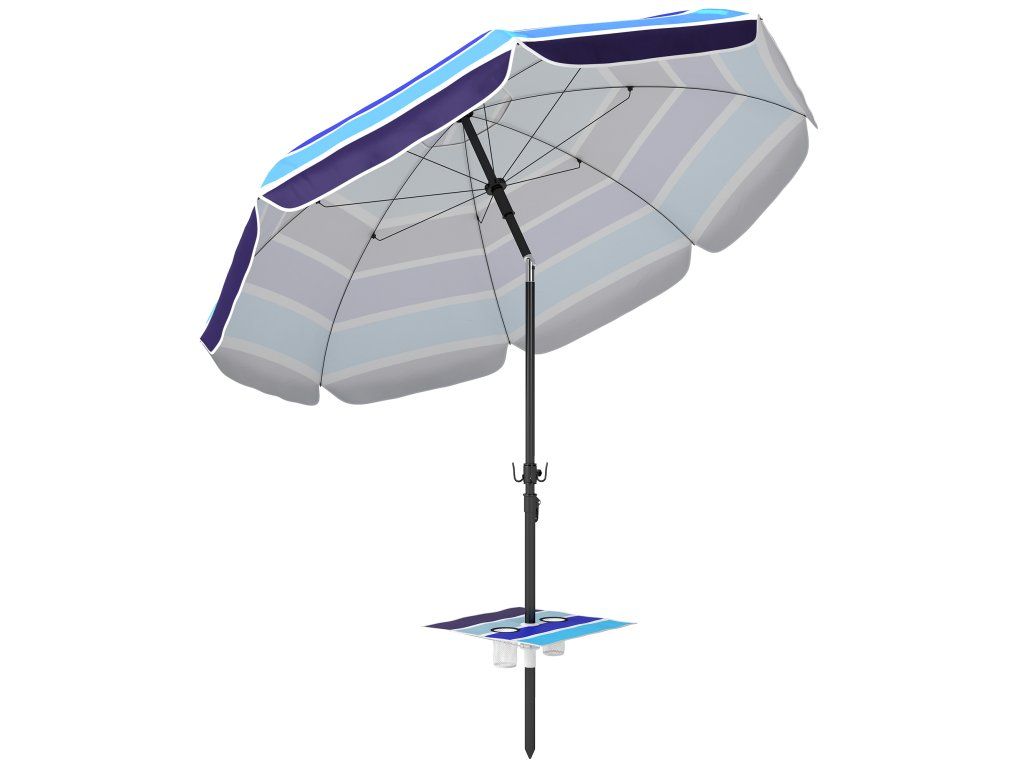 Plážový slunečník s integrovaným stolkem na vaše nezbytnosti nabízí řešení. Díky funkci náklonu 30° a ochraně UV30+ budete ve stínu a v bezpečí – pro bezstarostné užívání si na pláži.