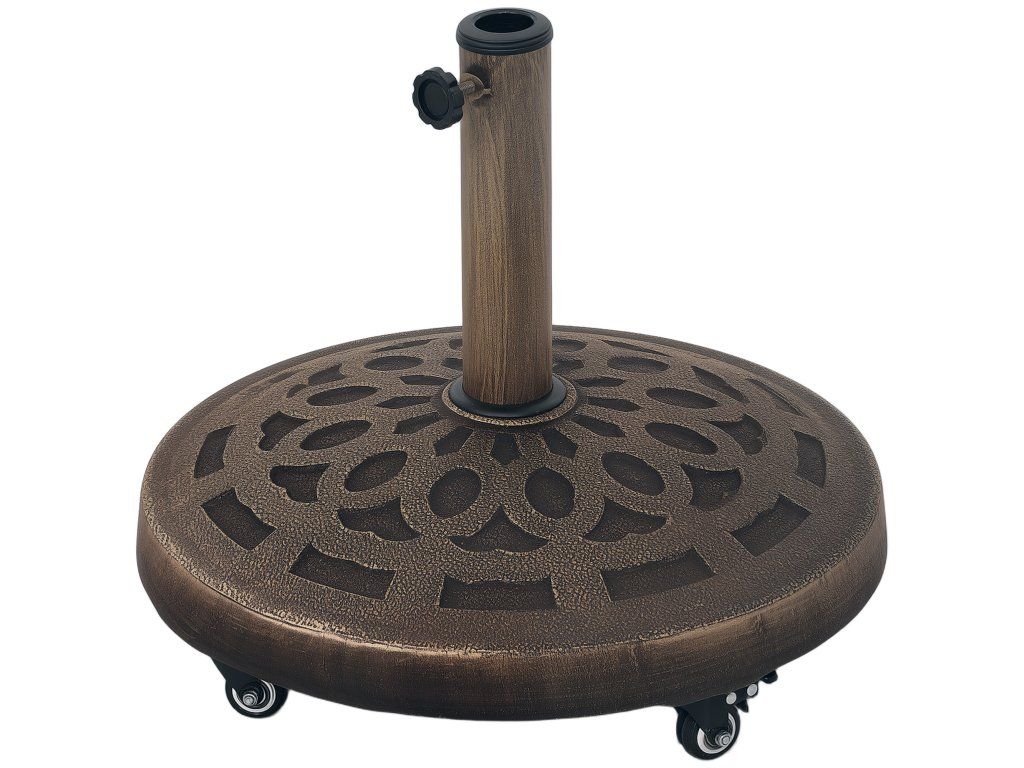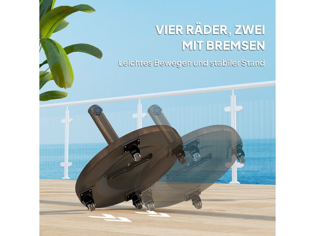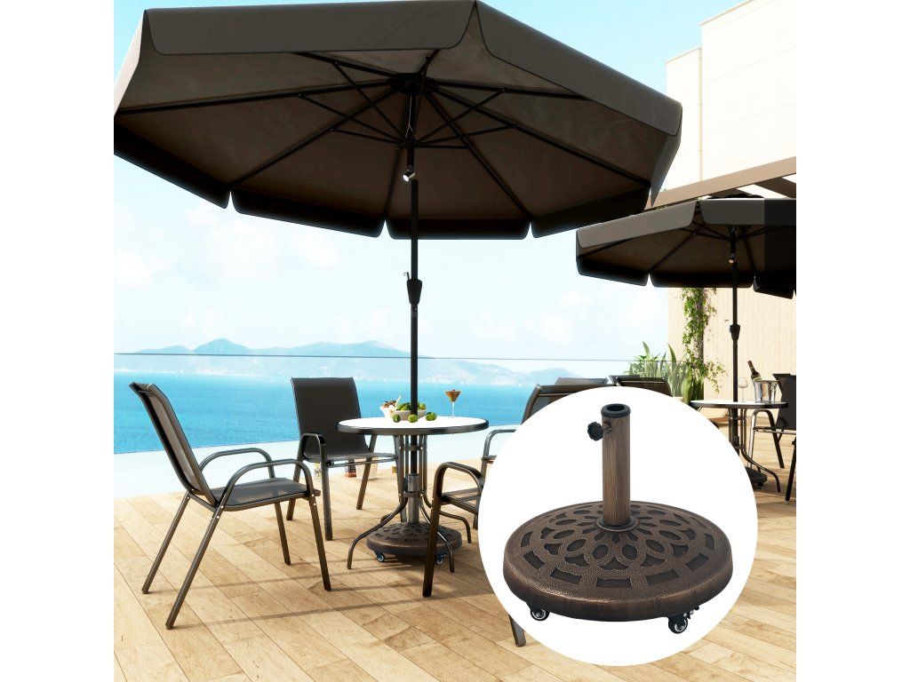 Robustní podstavec slunečníku: Tento podstavec slunečníku s hmotností 21 kg, vyrobený z kovové tyče s práškovým nástřikem a základny z pryskyřice a betonu, nabízí optimální stabilitu a odolnost. Stojan na slunečník s kolečky zajišťuje stabilní držení a je odolný vůči povětrnostním vlivům.
